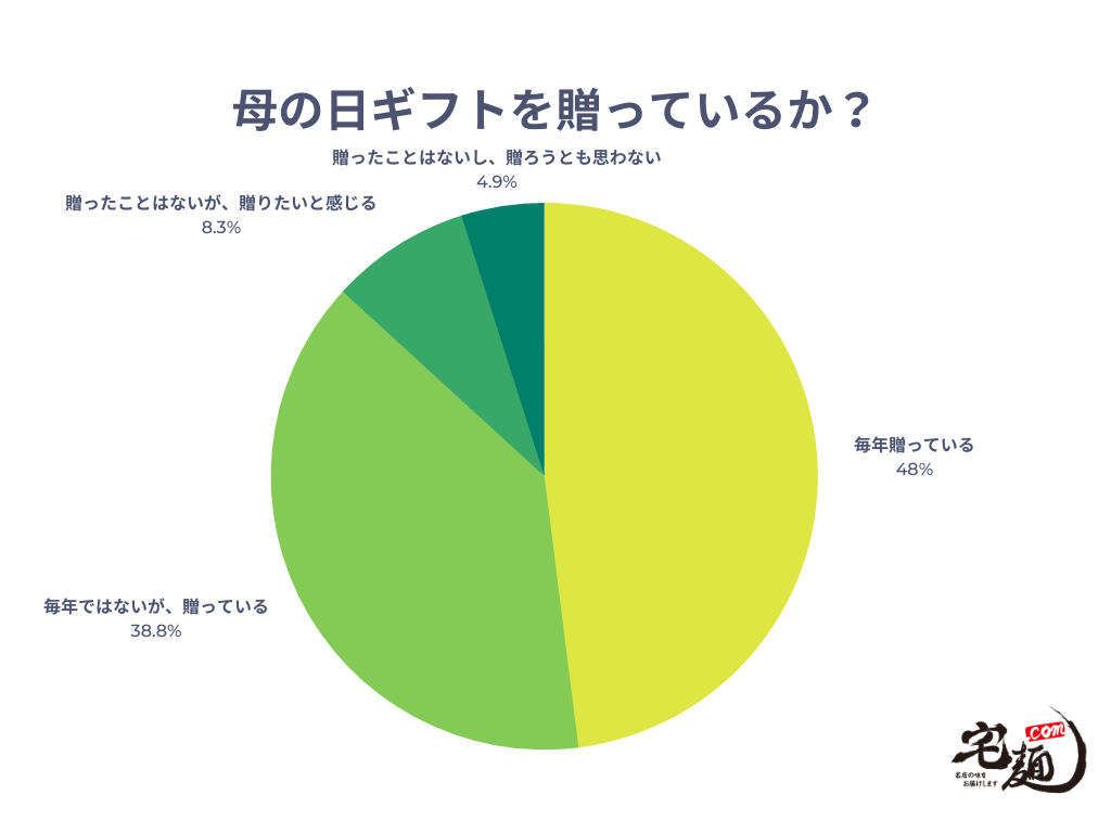 母の日ギフトを贈っているか聞いたところ、「ほぼ毎年贈っている」(48.0%)、「毎年ではないが、贈っている」(38.8%)を合わせて86.8%のユーザーが「贈っている」と回答しました。