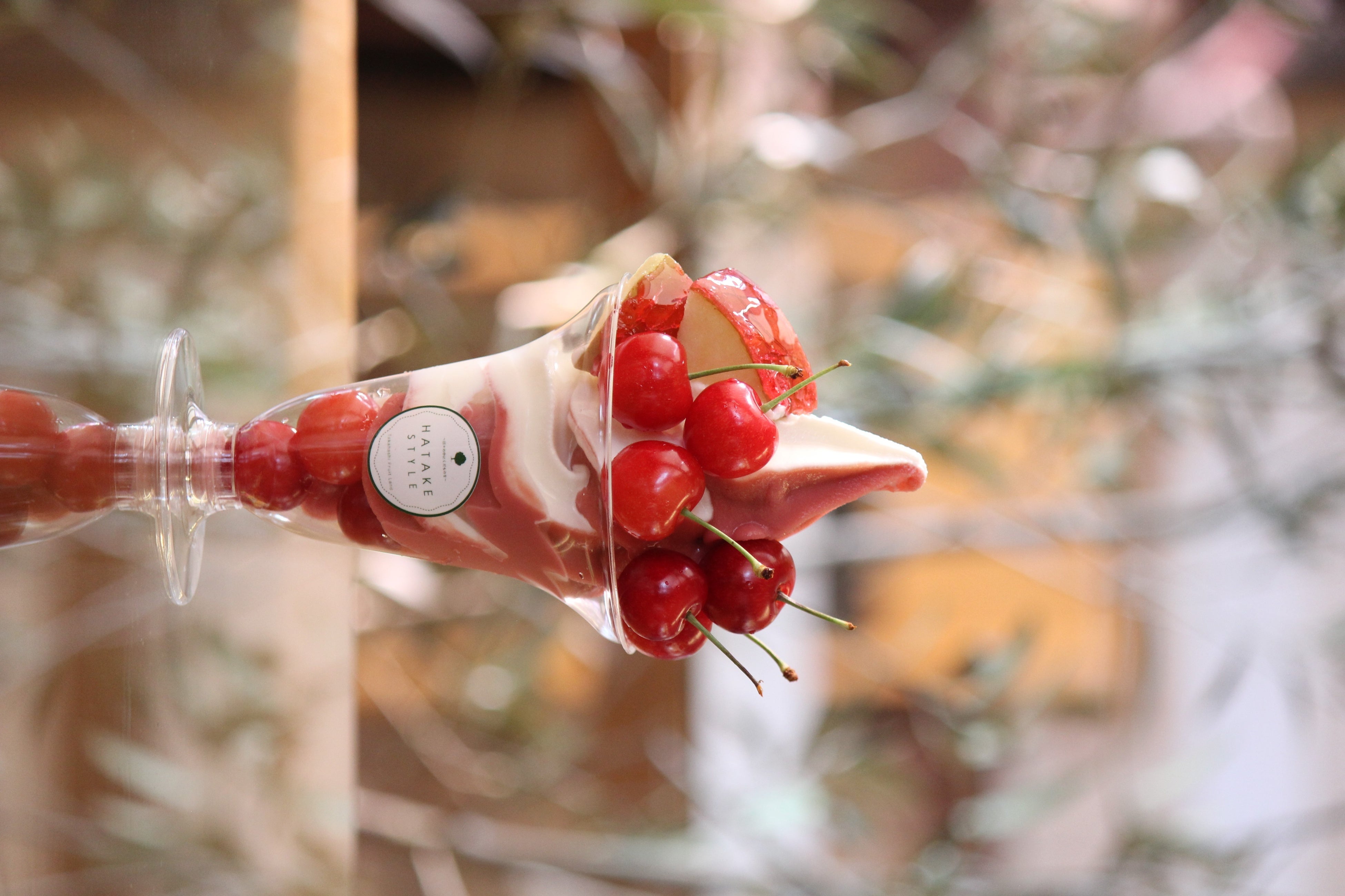 大粒のさくらんぼとりんご飴を飾り付けたパフェ。濃厚なソフトクリームがフルーツを引き立てます。