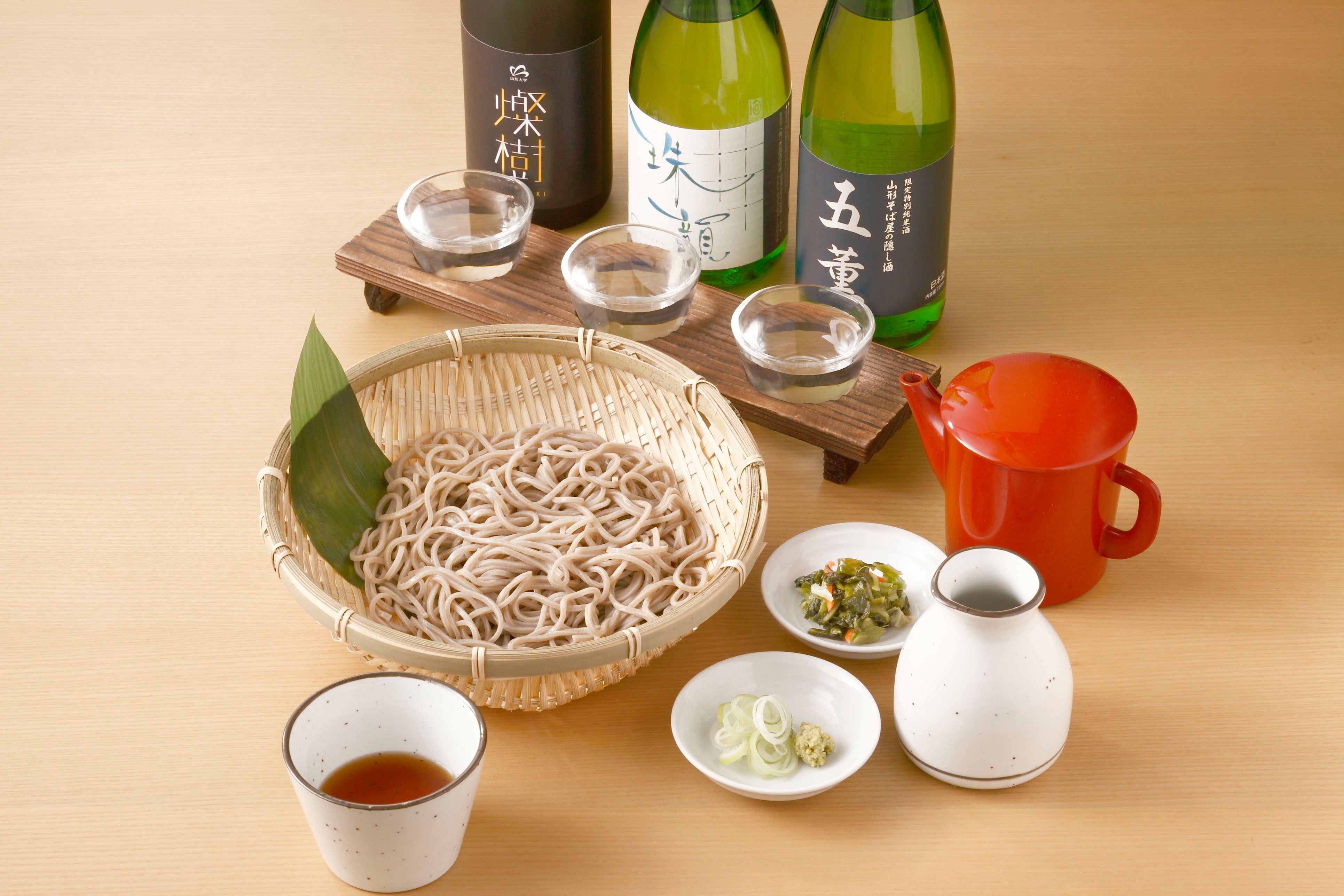 山形県産の「来迎寺在来」という香り高い品種を使用したもりそばに、そばとの相性を考えて造られた特別純米酒「五薫」など