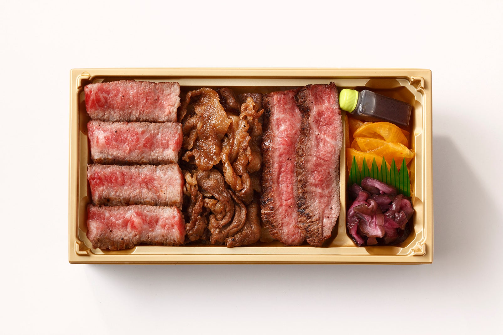 国産飼料だけを食べて育った山形牛のステーキと焼肉を1つに盛ったお弁当。