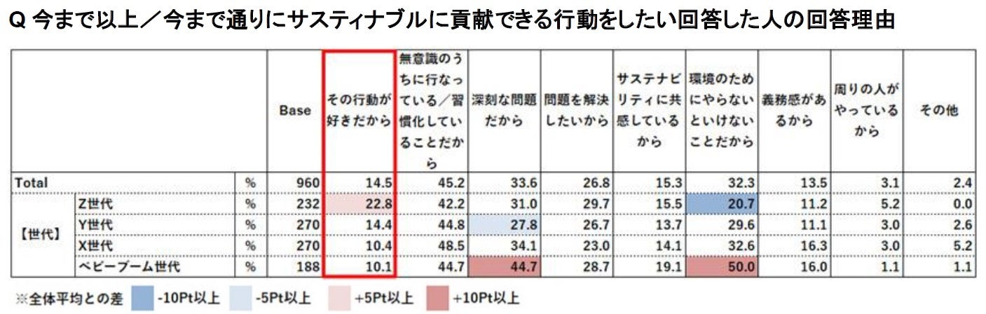 今後も続けていきたい理由「その行動が好きだから」は Z世代が他世代より約2倍高い結果に