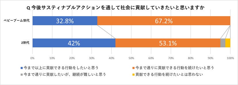 「今後サスティナブルアクションを通して社会に貢献していきたいと思いますか」という質問に対し、Z世代の42.0%が「今まで以上に貢献したい」と回答しました。義務感からアクションを起こすベビーブーム世代より約10ポイント高い結果となったことから、無理なく自然体に行うことがより一層サスティナブルアクションに繋がる傾向が見られました。(グラフ1)