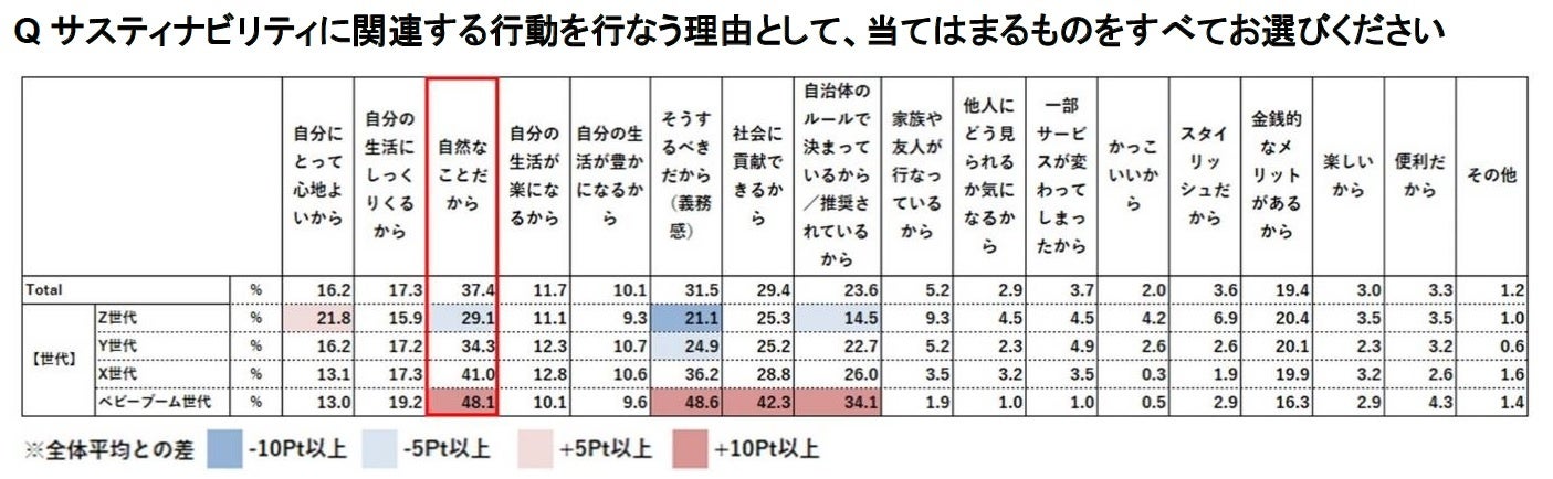 また、「自然なこと」と感じている人のうち、ベビーブーム世代は「そうするべきだから(義務感)」47.0%、「社会に貢献できるから」43.0%と答え、環境配慮への義務感から行動することが自然なことと考えられていることが分かりました。一方Z世代では、回答に多様性がみられるものの、「金銭的なメリットがあるから」23.8%、「自分にとって心地よいから」21.4%と、自分のやりたいこととして自然に行動を起こしている傾向が明らかになりました。(表2)