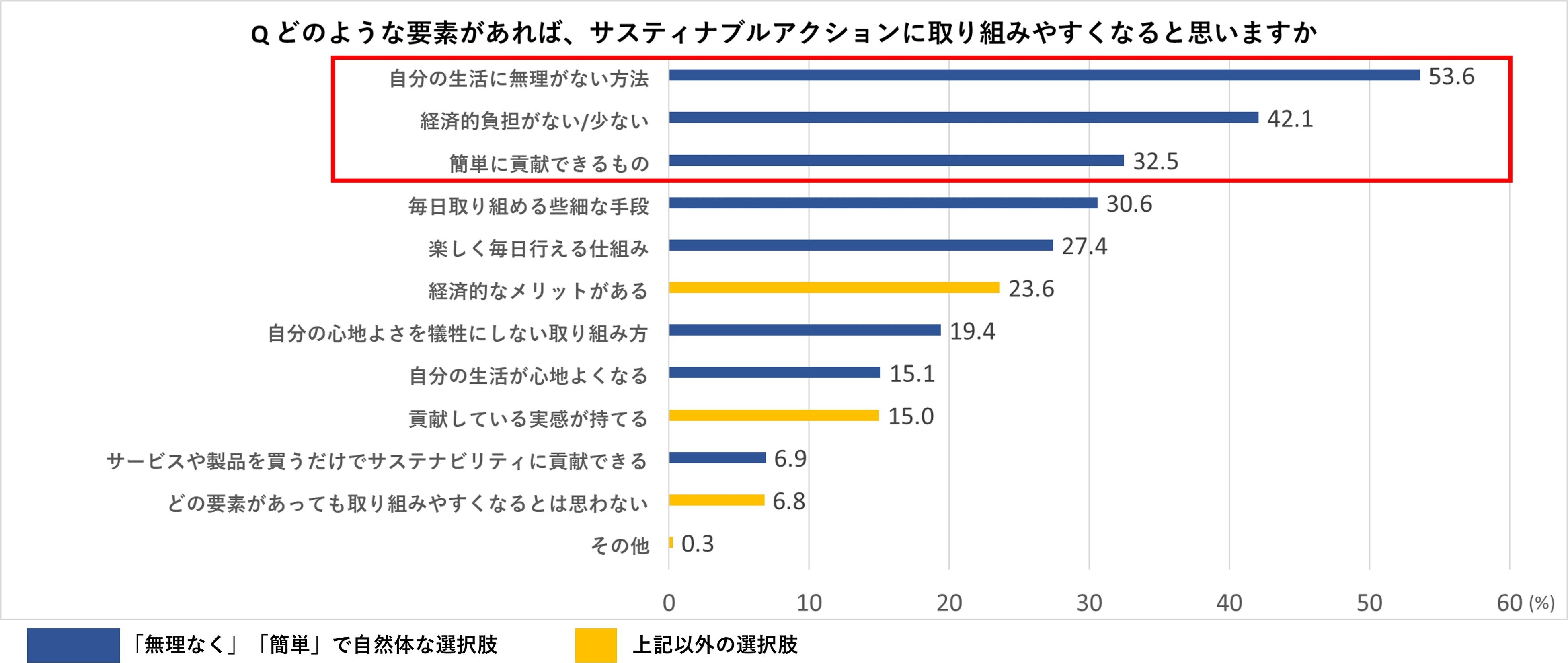 「実施できていないサスティナブルアクションに対し、どのような要素があれば取り組みやすくなると思いますか」という質問に対し、「自分の生活に無理がない方法」53.6%、「経済的な負担がない/少ない」42.1%、「簡単に貢献できるもの」32.5%という結果になりました。(グラフ2)