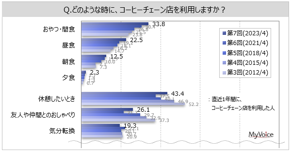 <今 回>(2023/4)https://myel.myvoice.jp/products/detail.php?product_id=29705 ※上記設問の他に「直近1年間に利用したコーヒーチェーン店」も聞いています。 <第6回>(2021/4)https://myel.myvoice.jp/products/detail.php?product_id=27306 <第5回>(2018/4)https://myel.myvoice.jp/products/detail.php?product_id=23706 |
