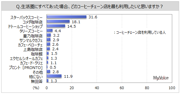 コーヒーチェーン店利用者が、最も利用したいチェーン店は、「スターバックスコーヒー」が31.6%、「コメダ珈琲店」「ドトールコーヒーショップ」が各10%台です。主に利用しているコーヒーチェーン店を、最も利用したいと回答した人は、「コメダ珈琲店」「スターバックスコーヒー」で各70%台と高くなっています。