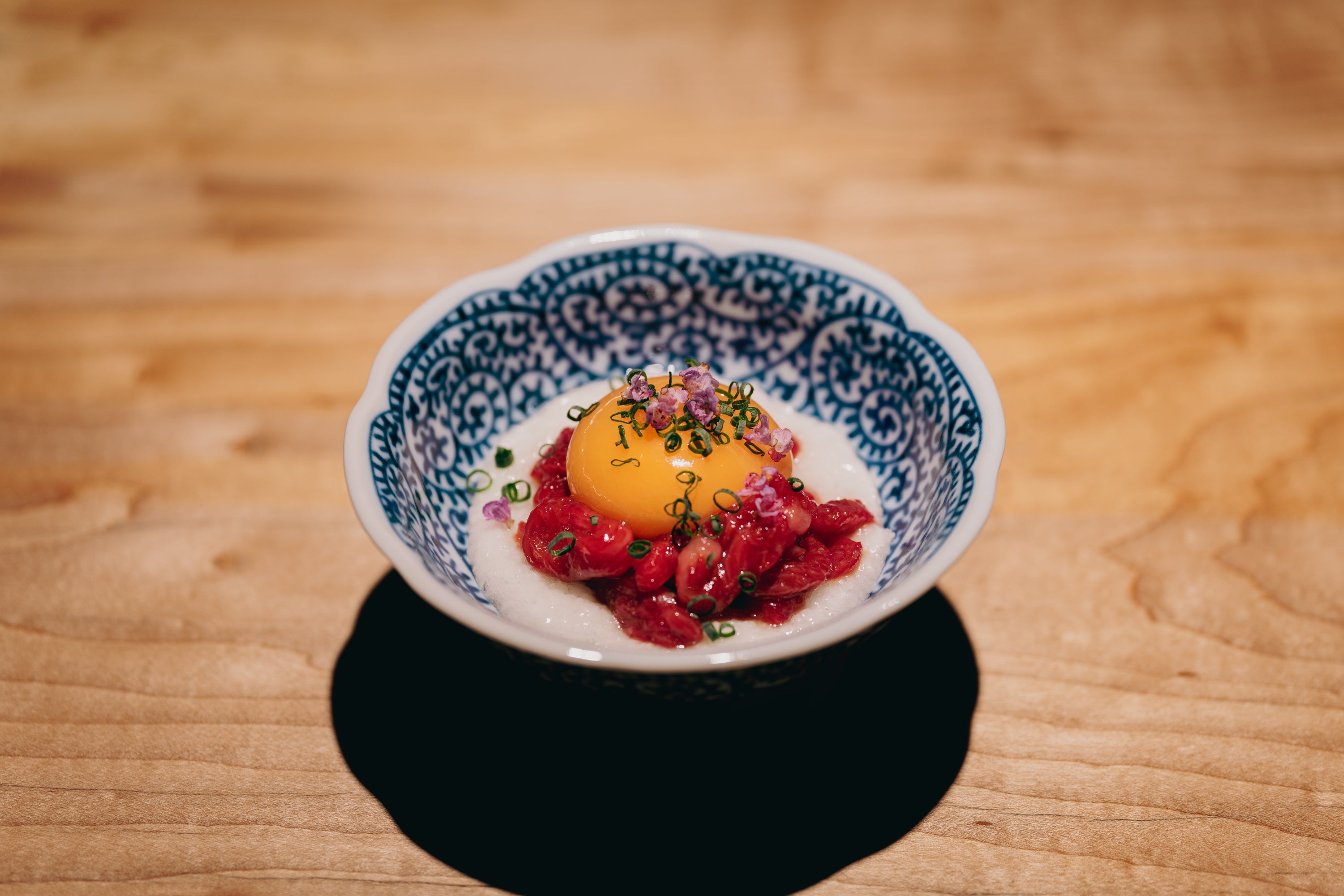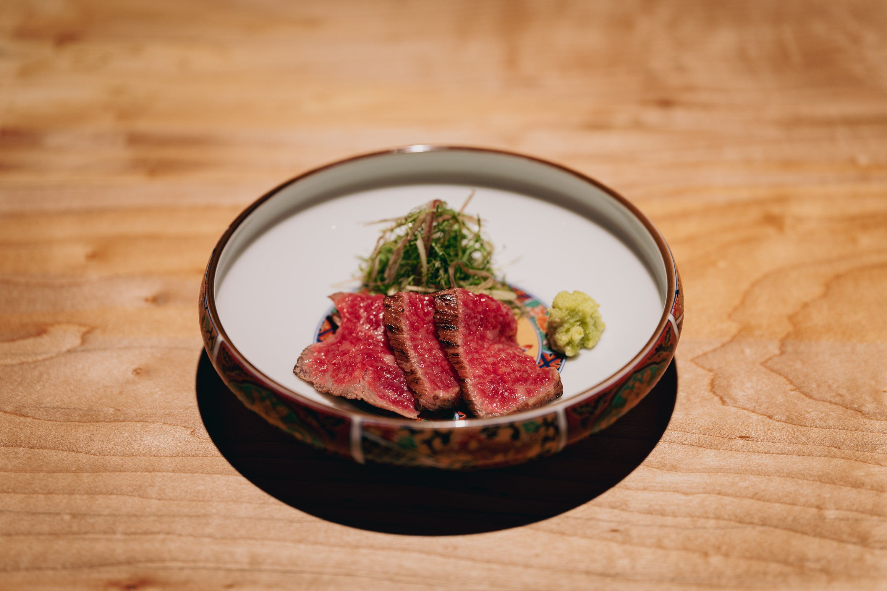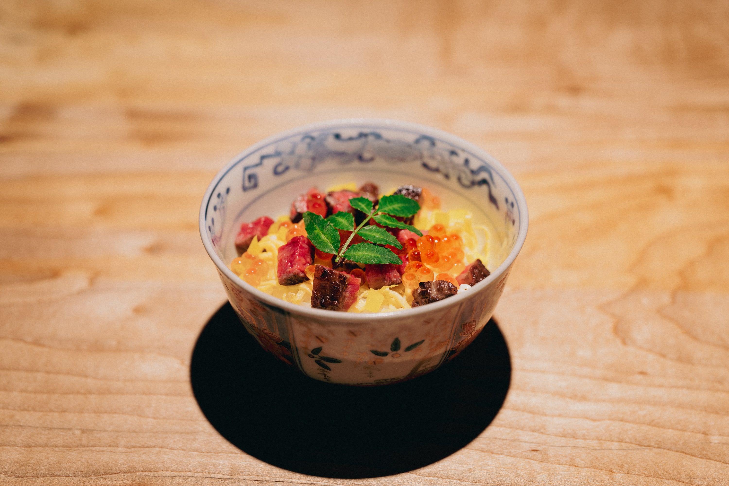 炭火で焼いた神戸牛やいくらなどを180年前、江戸時代の和食器と共に〆る。