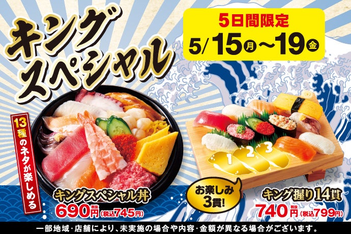 持ち帰り寿し店の「⼩僧寿し」「茶⽉」を運営する株式会社⼩僧寿しは、持ち帰り寿し店「⼩僧寿し」にて、5月15日(月)~19日(金)の期間限定で、「キングスペシャルフェア」を開催致します。