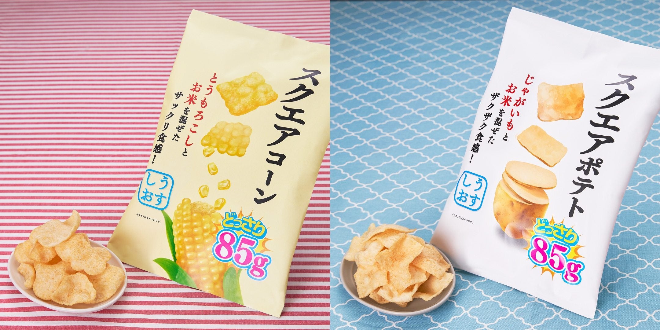 (左)スクエアコーン 内容量85g (右)スクエアポテト 内容量85g