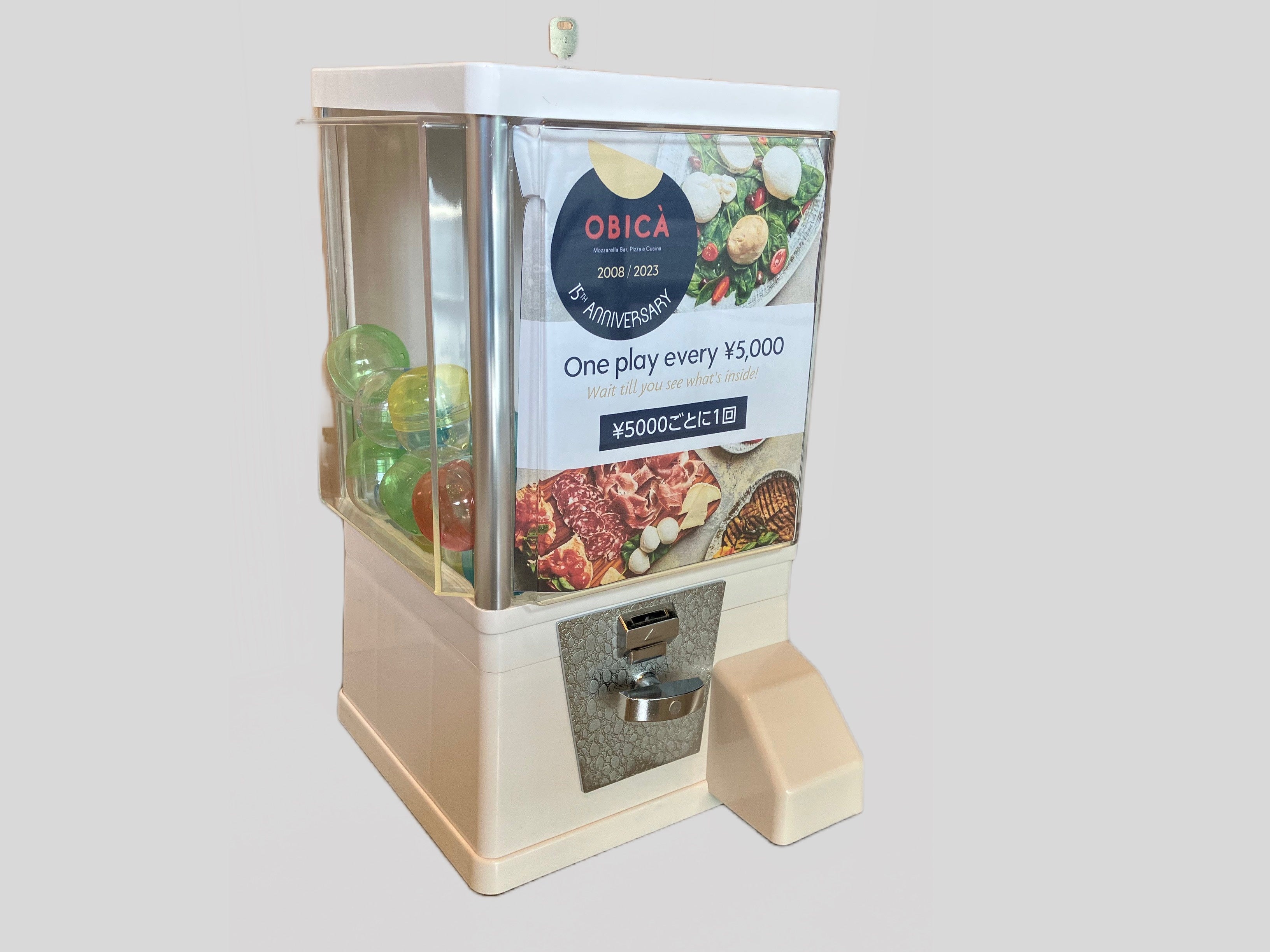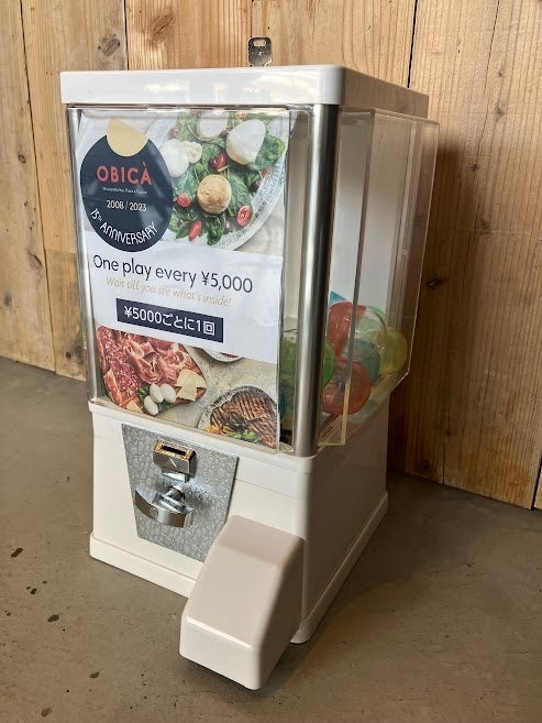 イベント第1弾は”ガチャガチャ”です。一部店舗(※2)を除き、ご利用金額5,000円以上につき1回”ガチャガチャ”を回していただけます(10,000円で2回、15,000円で3回を回せます)。”ガチャガチャ”の景品は、オービカ自慢の水牛モッツァレラチーズ”モッツァレラ クラシカ80g”や、トリュフピッツァ”タルトゥーフォ”、プレミアムワイン”フェッラーリ オーガニック ボトル”など、次回ご利用いただけるアイテムがずらり。ディナーコースご招待チケットもお宝アイテムとして含まれています。