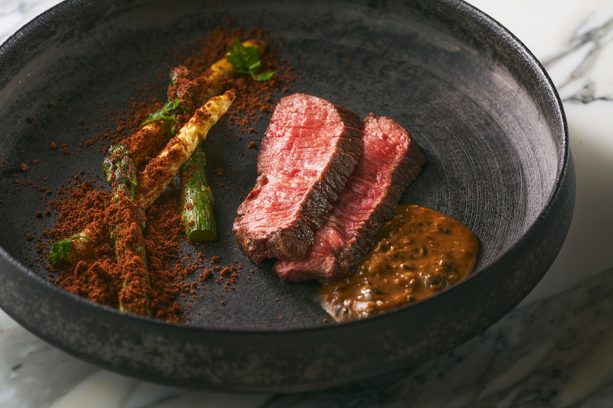 ※10,000円コースは+2,000円、15,000円コースは+1,200円で、徳島県産黒毛和牛「阿波牛」を使用した「2色のアスパラガス/実山椒/阿波牛」 にアップグレードいただけます。