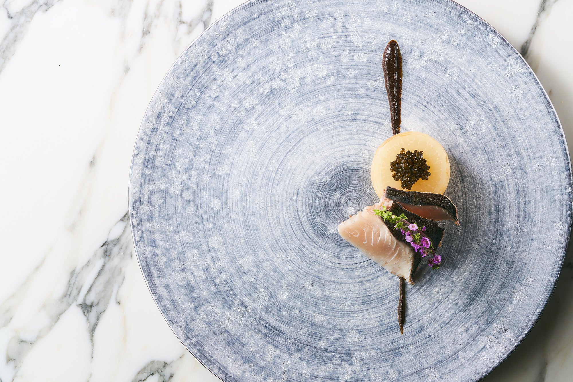 素材の旨味を閉じ込めるために一度素揚げして、お出汁でやさしく炊いた蕪は、蕪本来のやさしい甘さと滑らかな舌触りをお楽しみいただけます。上に添えた、キャビアの塩味がアクセントに。