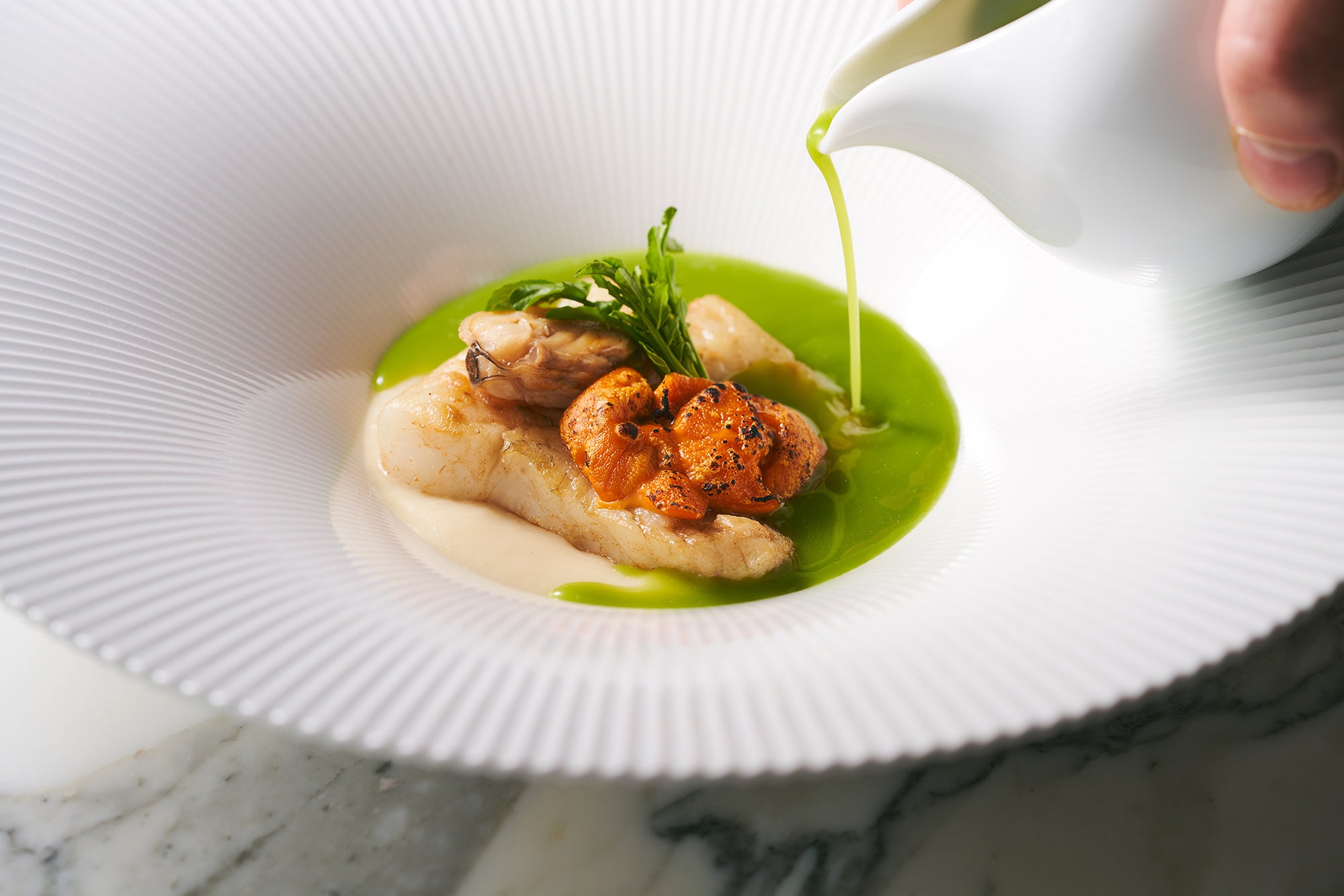 クレソンと蛤をはじめとする貝のお出汁を合わせた、鮮やかな緑色のソースをかけてお召し上がりいただきます。