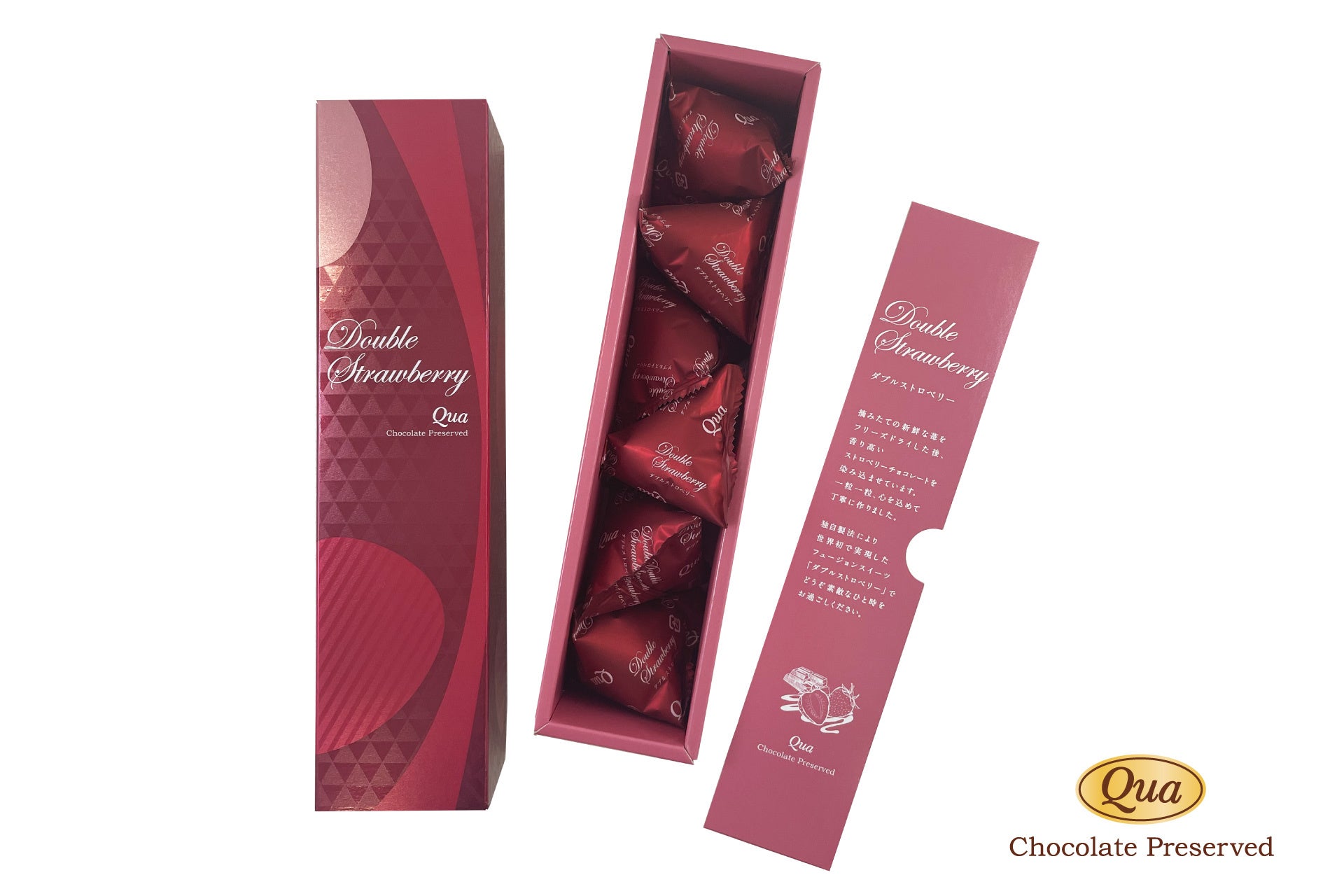 「ダブルストロベリー」は、フリーズドライ苺に香り高いストロベリーチョコを染み込ませた濃厚苺スイーツです。「苺に苺を染み込ませた」ダブルストロベリーは、ひとくち食べると「苺」が溢れんばかりに口いっぱいに広がります。未だかつてない驚異的な「苺感」をお楽しみいただけます。