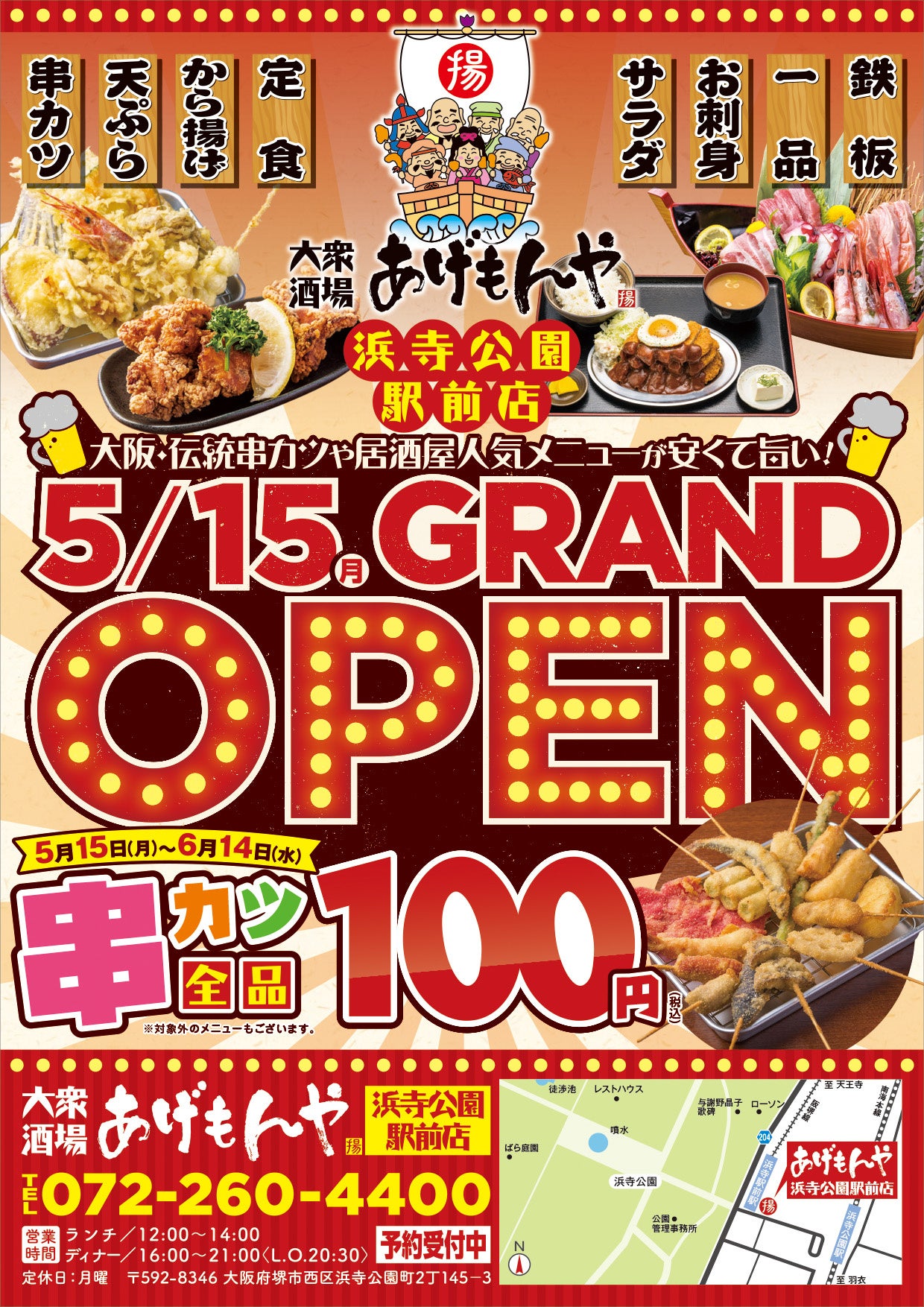 浜寺公園駅前店のオープンを記念して、5/15(月)〜6/14(水)の期間中、当店自慢の串カツを特別価格全品100円(税込)にて提供いたします。