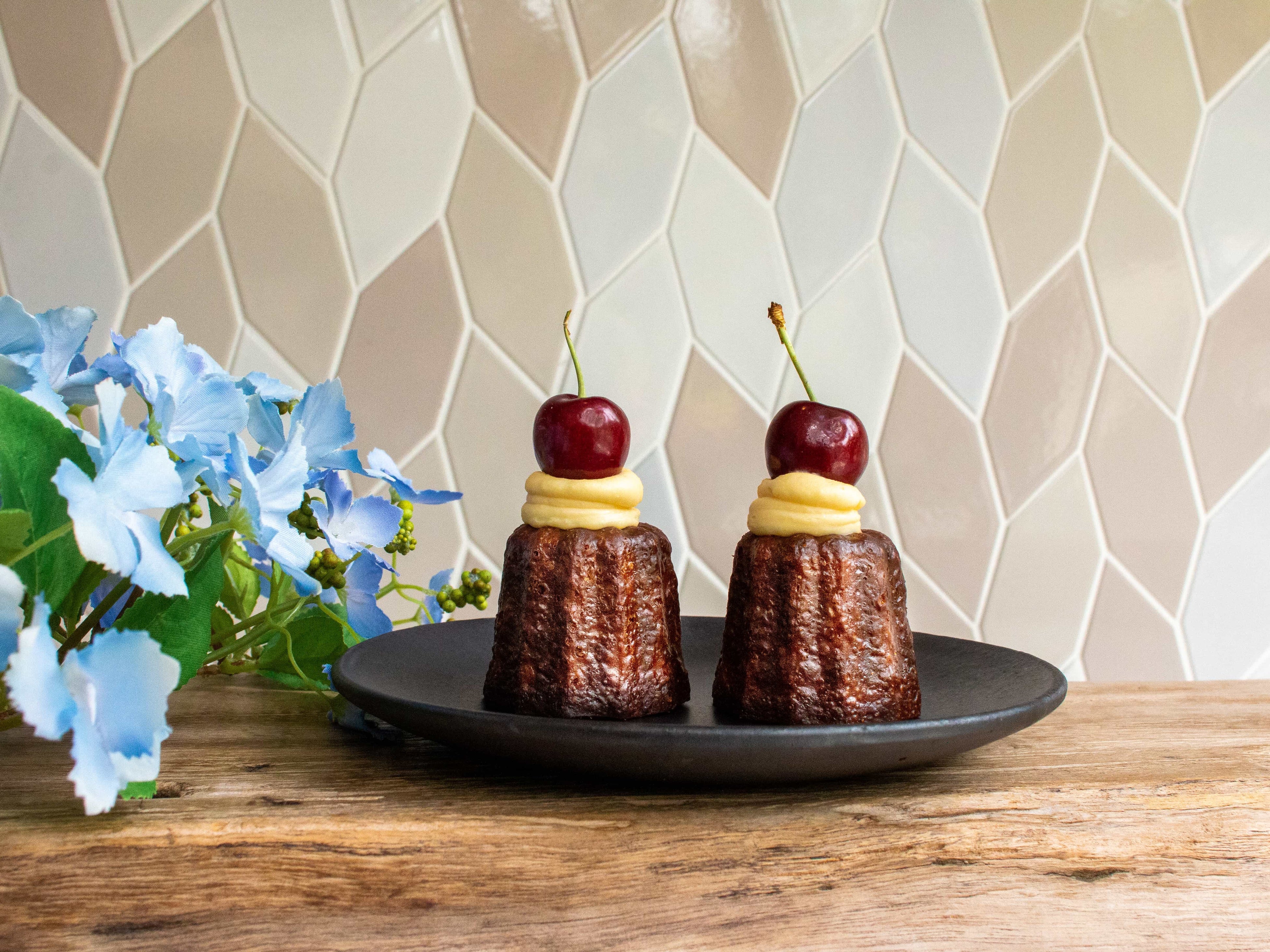 人気のカヌレの中にパッションフルーツソースを閉じ込め、オリジナルクリームにアメリカンチェリーを添えてケーキ仕立てに仕上げた一皿。甘いカヌレに程よい酸味が加わりよりおいしくお召し上がりいただけます。