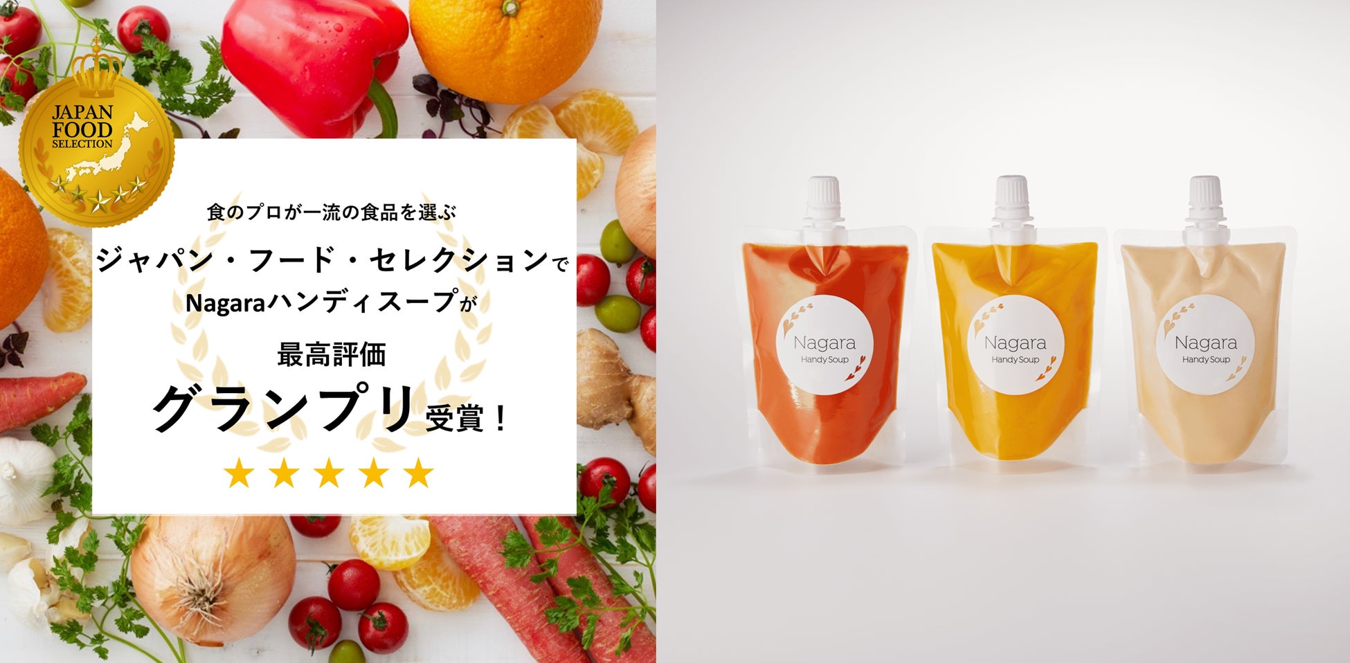 Nagaraハンディスープは、そのまま飲める飲み口付きパウチの本格的な冷製スープ。レシピは大手外資系ホテルでシェフを務めた岡嶋伸忠氏が監修。白いトウモロコシ「ピュアホワイト」や雪の中で育った「ふかうら雪人参」、特別な“アイメック農法”で作ったフルーツトマト「フォレストフルティカ」など素材からこだわった本格的な味わいを、いつでもどこでも手軽に楽しめるのが特徴です。化学調味料・保存料・着色料不使用なので小さなお子様も安心して食べていただけます。