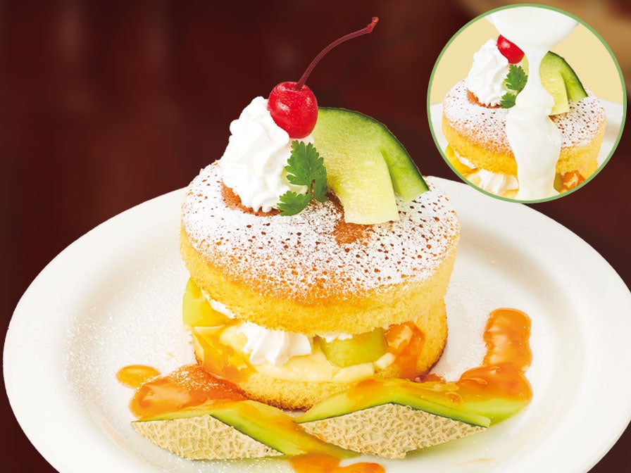 “ふんわり”厚切りスフレパンケーキのメロン添え/メルティクリーム付(税込989円)