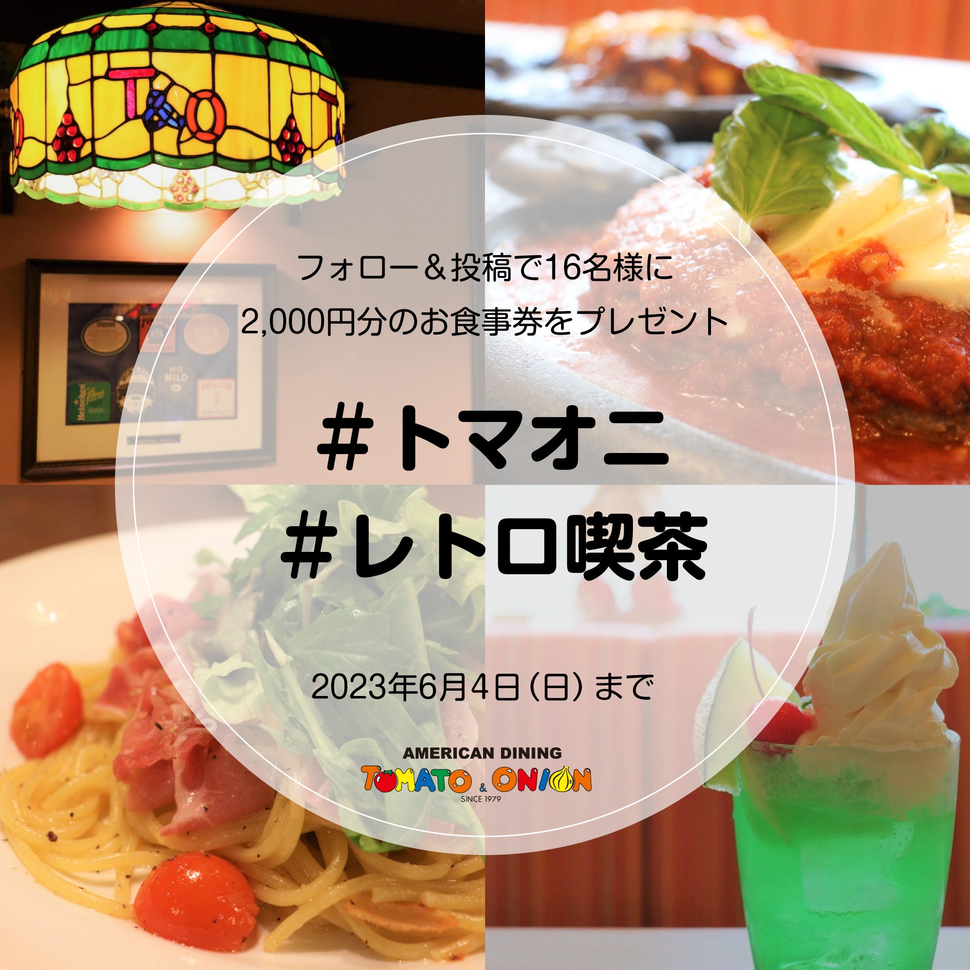 投稿いただいた方の中から抽選で16名様(016=レトロ)にトマト&オニオンで使える2,000円分のお食事券をプレゼント