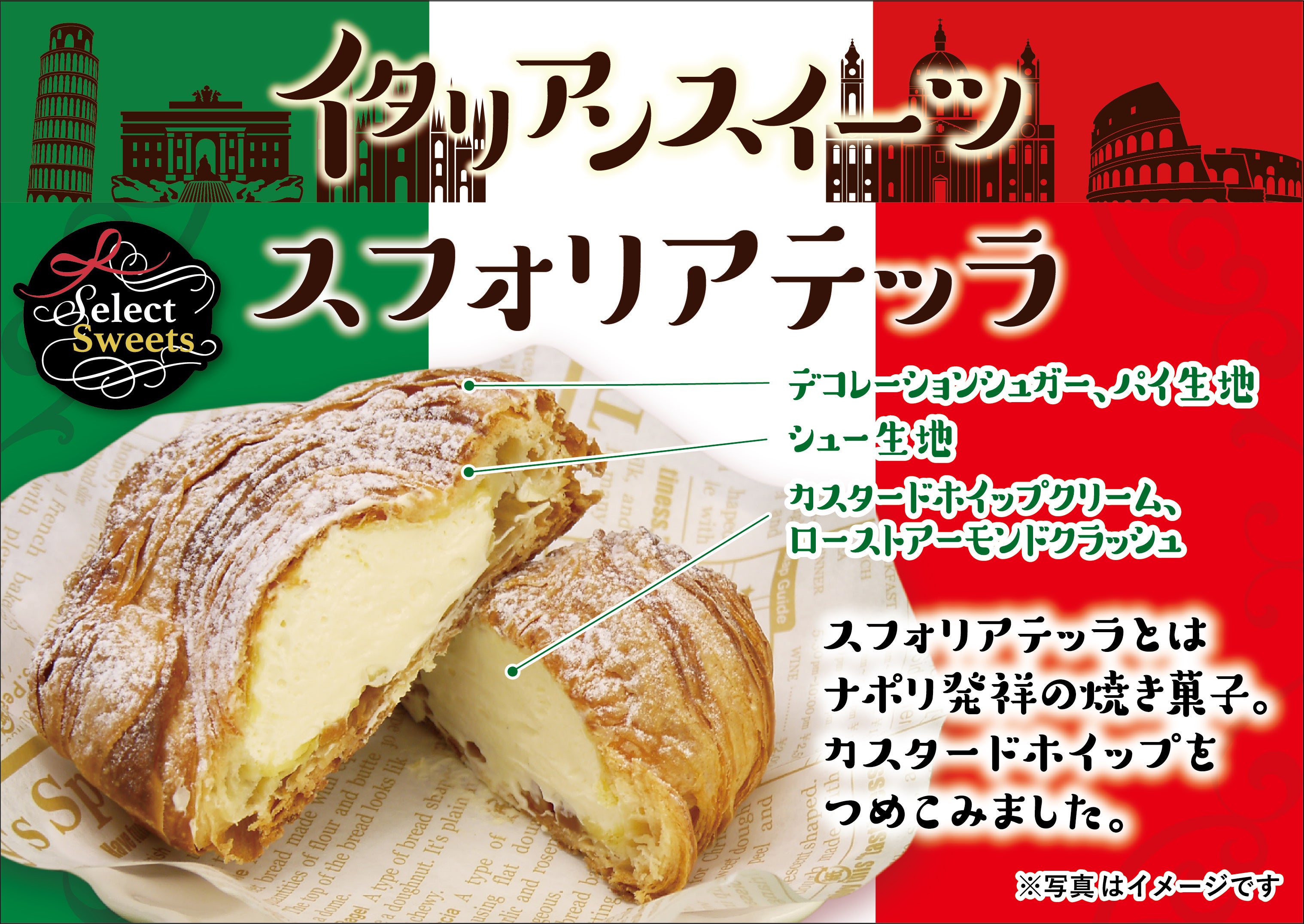 本フェアでは、イオンのスイーツシリーズ「Select Sweets」から、イタリアに由来のある「スフォリアテッラ」や「マチェドニア」、「モンブラン」や、イタリアのシチリア産レモンソースを使用したティラミスといった、期間限定のスイーツを4品目展開します。