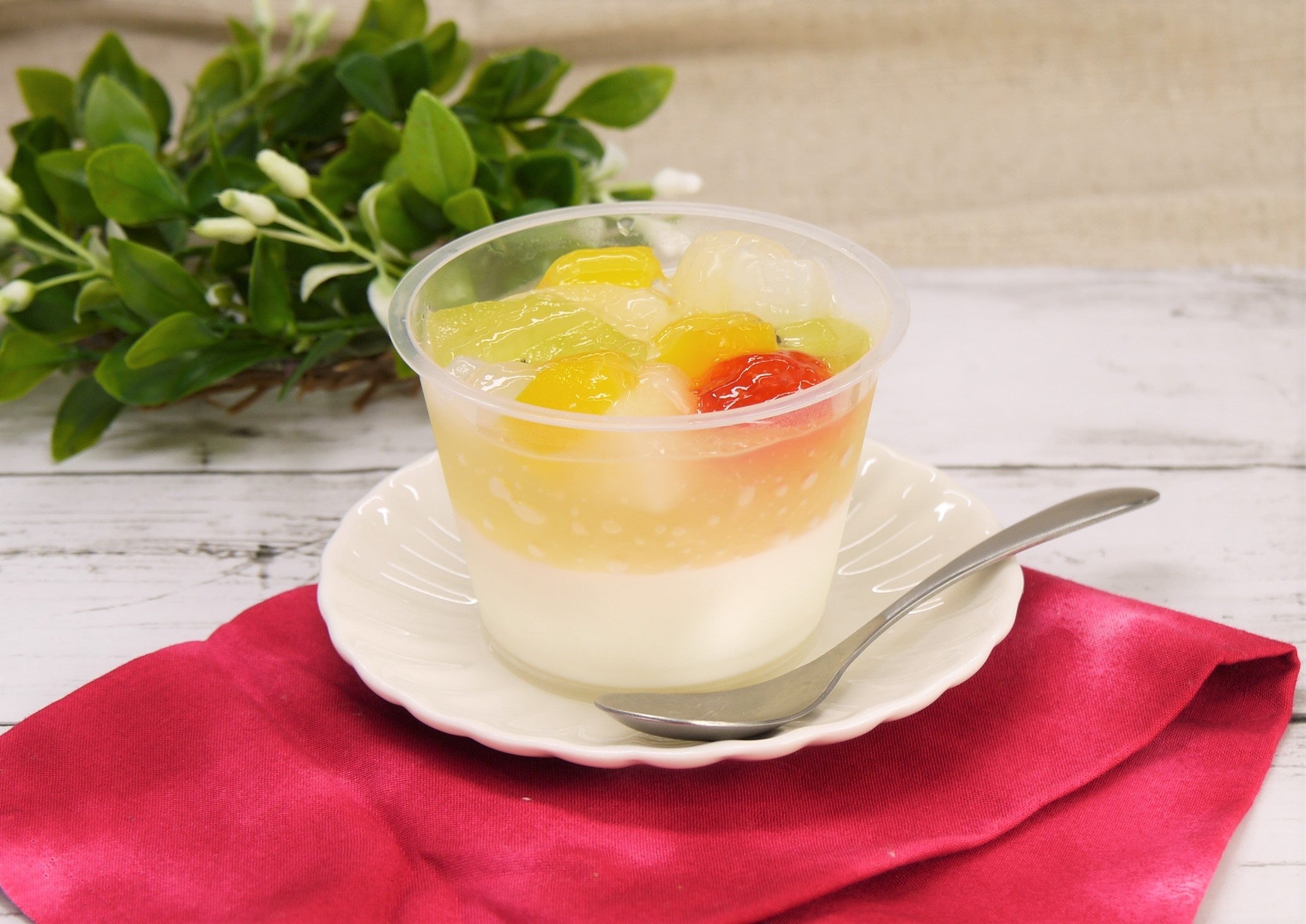 イタリア伝統菓子「マチェドニア」をイメージした、ジューシーなフルーツ、みずみずしいゼリーをさっぱりとお楽しみいただけるパフェです。ミルクプリンに白ワイン風味ゼリーを重ね、白桃、マンゴー、キウイ、ナタデココ、苺ソースをトッピングしています。