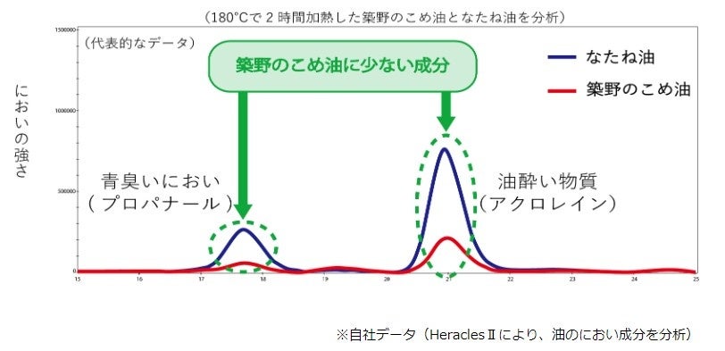 こめ油は酸化しにくく、油酔い物質と青臭いにおいの発生量が一般的なサラダ油と比較して少ないのが特徴です。揚げ物をすると部屋中に油のニオイが立ちこめて、気分が悪くなったり食欲がなくなったりする「油酔い」と言われる状態になります。こめ油はこれらの発生量が少ないので、快適に調理ができ、部屋にイヤなニオイが充満しにくいです。