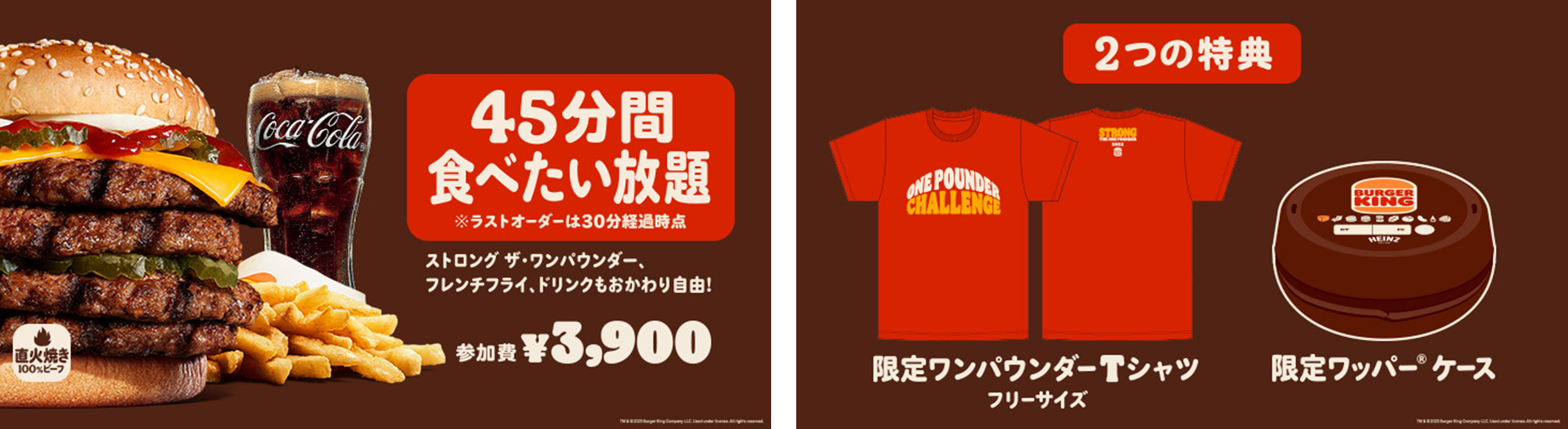 『ストロング ザ・ワンパウンダー』、フレンチフライ(M)、ドリンク(M)各商品を、それぞれ完食していることを条件に、いずれも制限時間45分以内でおかわり自由の食べたい放題イベントです。