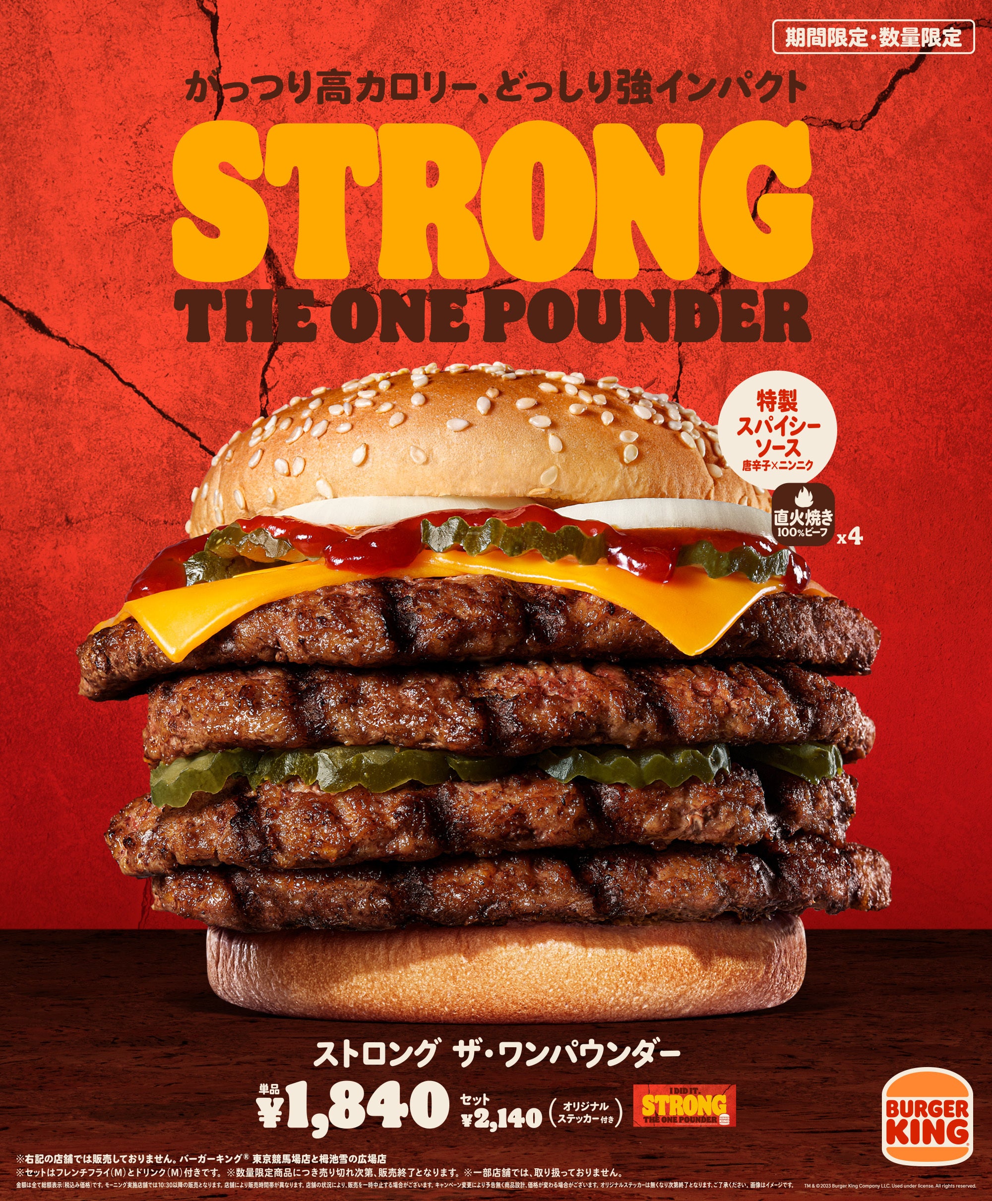 ぜひ、バーガーキング® 自慢の直火焼きの100%ビーフパティを4枚重ねた超大型バーガー『ストロング ザ・ワンパウンダー』での食べたい放題も、満足ゆくまでお楽しみください。