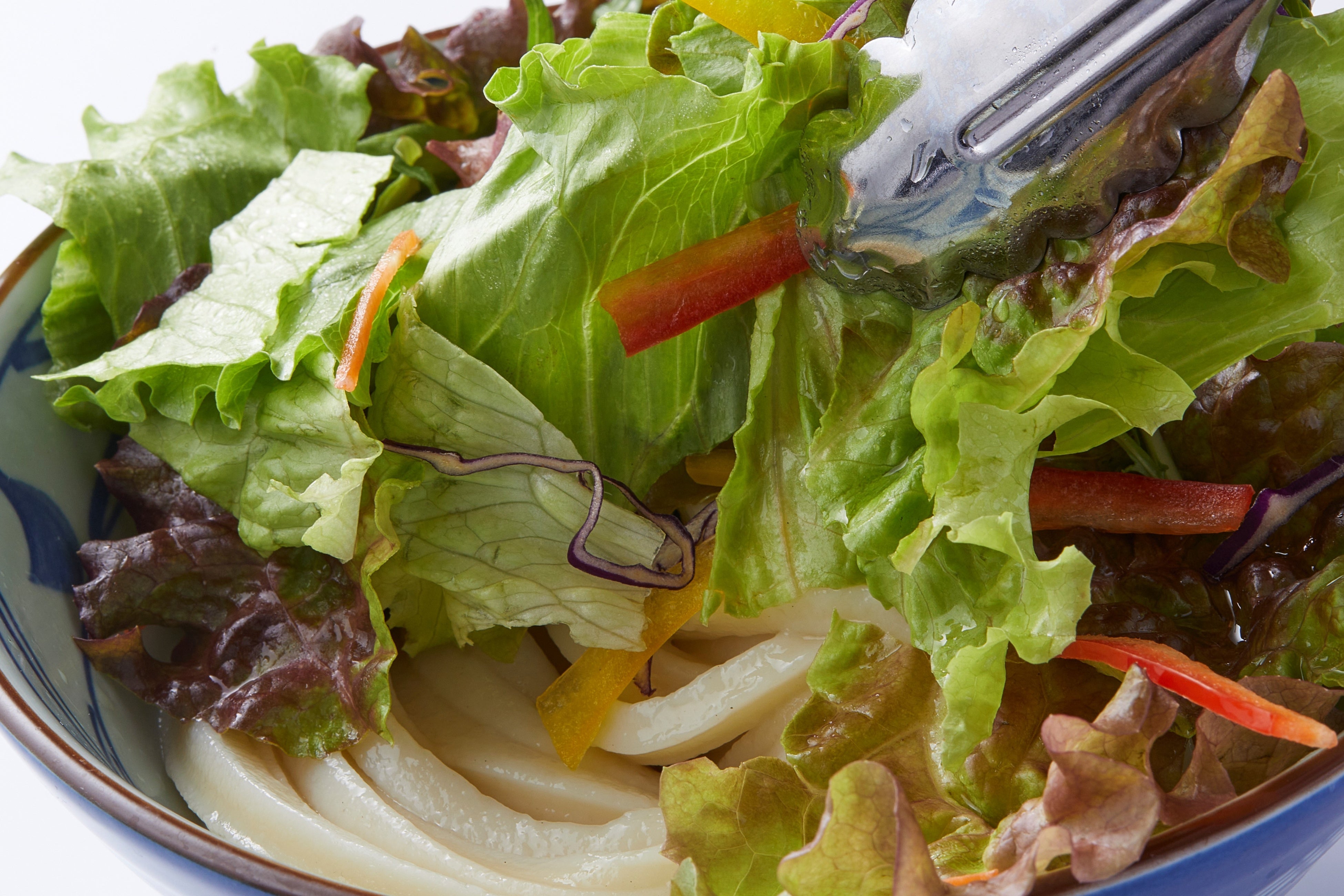 つるつるとのどごしの良い冷たいうどんとの相性を一番に考えて、厳選された彩り豊かな野菜たち。シャキシャキと食感のよいリーフレタスや、水菜、甘味のある彩り豊かなパプリカなどのフレッシュな生野菜をブレンドしています。つるっとしたうどんの食感を楽しみながらも、麺と一緒にもりもり食べれるように、野菜のサイズやカットにもこだわりました。