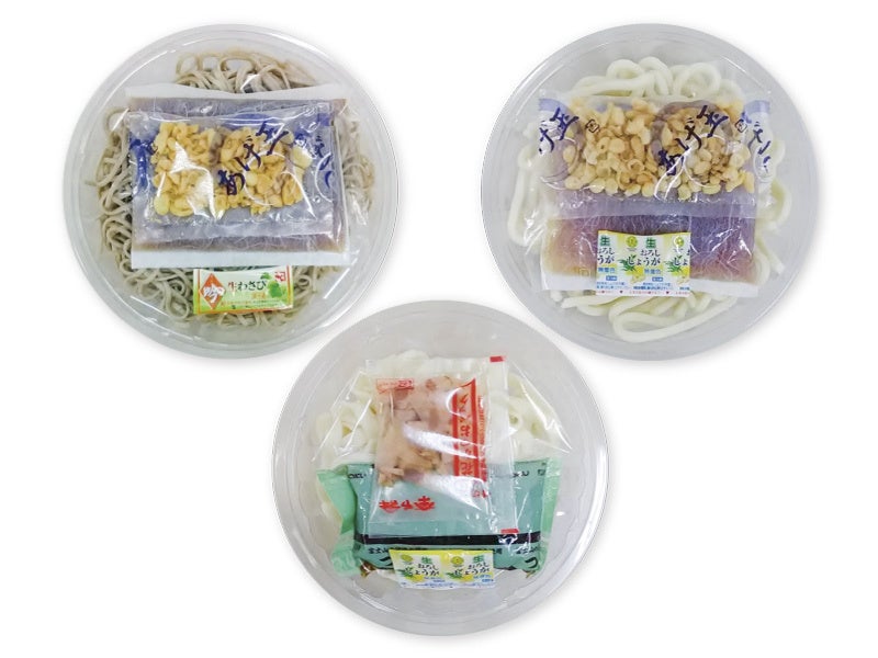 (写真左から時計回りに)ぶっかけ冷したぬきそば(税込279円)・ぶっかけ冷したぬきうどん(税込279円)・ぶっかけ冷しきしめん (税込214円)