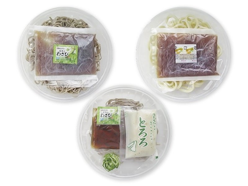 (写真左から時計回りに)ぶっかけ冷したぬきそば(税込279円)・ぶっかけ冷したぬきうどん(税込279円)・ぶっかけ冷しきしめん (税込214円)