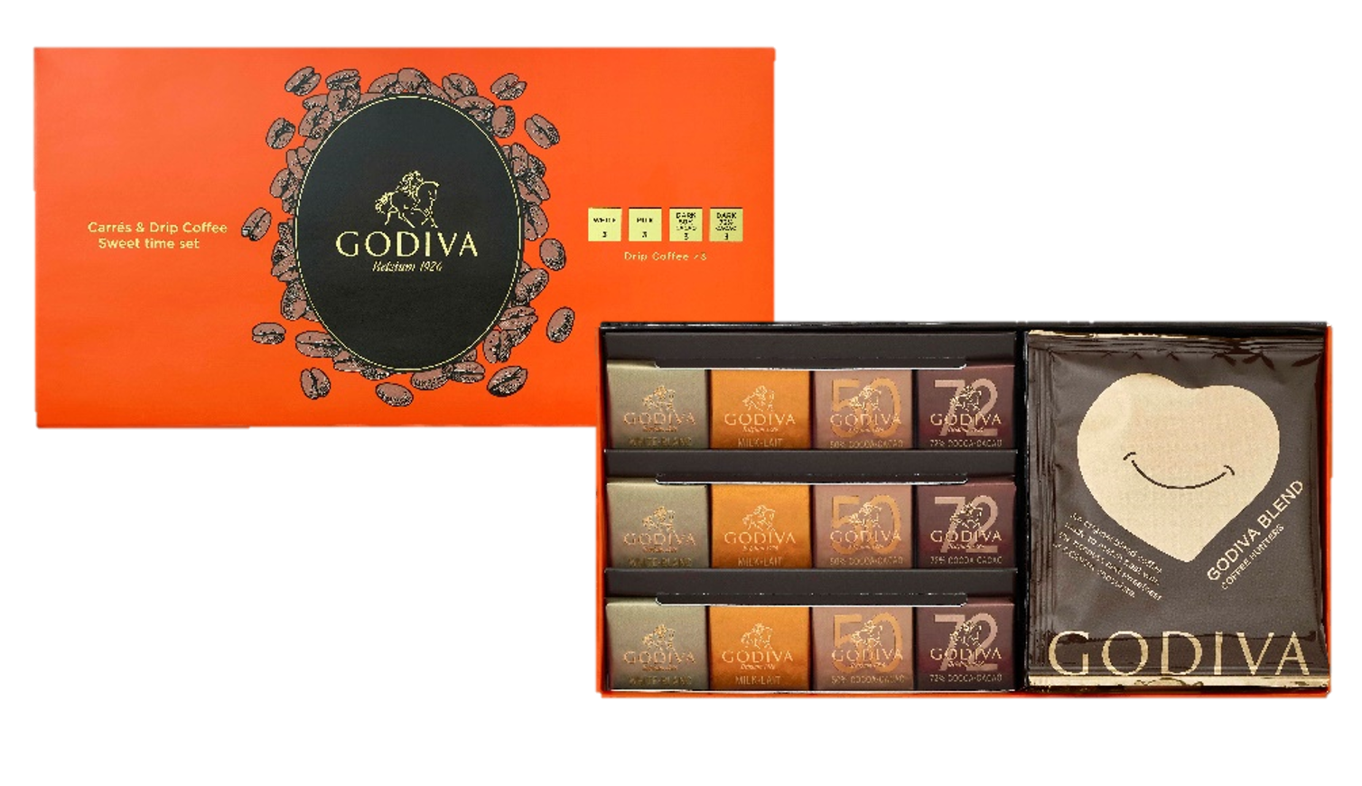 「カレ&コーヒー スイートタイムセット」は、ゴディバのチョコレートへのこだわりが際立つ、薄いスクエアタイプのチョコレート「カレ」と、ゴディバオリジナルのドリップバッグコーヒーを詰め合わせました。 「カレ ホワイト」、「カレ ミルク」、「カレ 50%ダーク」、「カレ 72%ダーク」の4種類のカレとコーヒーをお楽しみください。