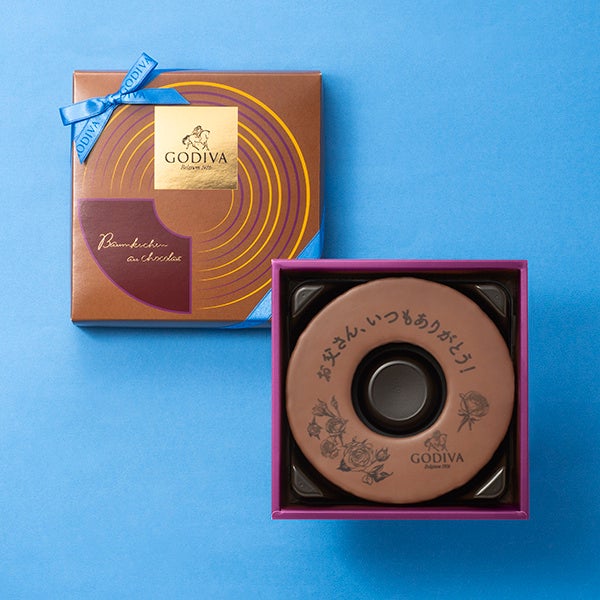 「ゴディバ 父の日お祝いメッセージ入りバームクーヘン オ ショコラ」は、ダークチョコレートを溶かした生地をゆっくりと丁寧に焼き上げ、ミルクチョココーチングした、カカオの風味豊かなバームクーヘンです。天面には、お父さん、いつもありがとう!のメッセージとシックなバラの線画で感謝の気持ちを表現しました。