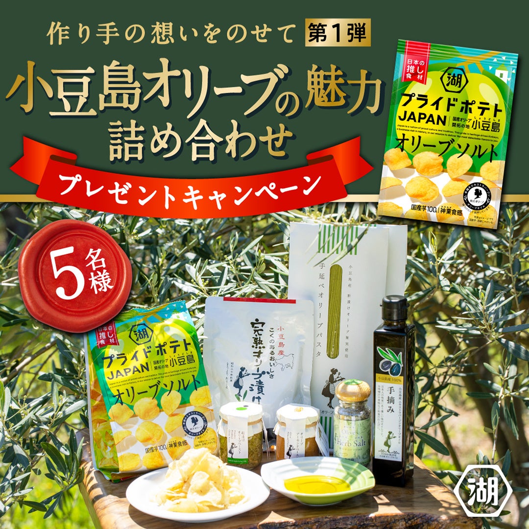 「湖池屋プライドポテト JAPAN オリーブソルト 小豆島」の発売をきっかけに、“小豆島オリーブ”の魅力を全国のみなさまに知っていただきたく、小豆島オリーブの歴史や魅力、生産の裏側などをまとめた「作り手の物語記事」をweb上にアップしました。今回のキャンペーンは、こちらの記事をお読みいただいた上でシェアしていただくと、ご応募できる形式となっています。プレゼントには「湖池屋プライドポテト JAPAN オリーブソルト 小豆島」だけでなく、当商品にも使用されている「小豆島産エキストラバージンオリーブオイル[手摘み]」をはじめとした、オリーブに関連した豪華な商品の詰め合わせをご用意しています。記事を通して“作り手の想い”をご覧になられた上で、ぜひ日本の推し食材“小豆島オリーブ”の詰め合わせが当たるキャンペーンにご応募ください。