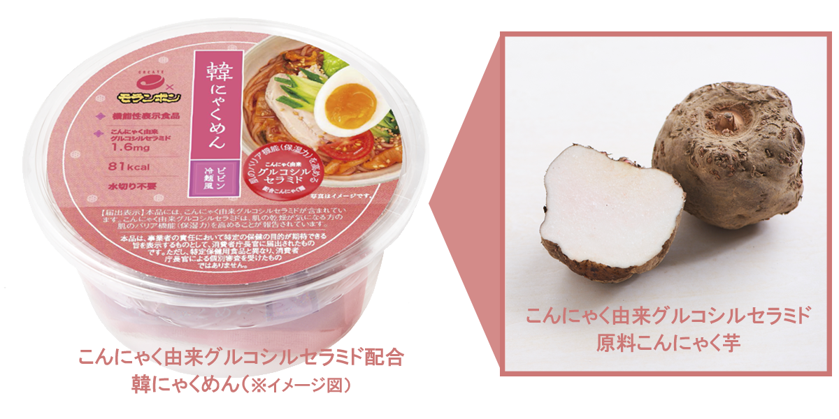 「韓にゃくめん ビビン冷麺風」は、水切り不要のこんにゃく麺とたれを混ぜ合わせて食べるこんにゃく加工食品です。当社の機能性食品成分であるこんにゃく由来グルコシルセラミドがこんにゃく麺の関与成分として採用されました。