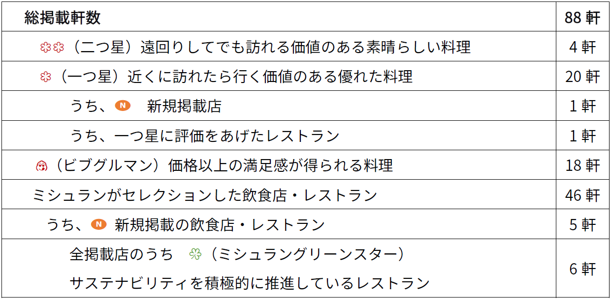 ・ 一つ星は昨年の評価を維持した18軒と、昨年はミシュランがセレクションした飲食店・レストランとして掲載され、評価を上げた「ダ テッラ」/イタリア料理、新たに掲載された「レガ」/イタリア料理の20軒でした。