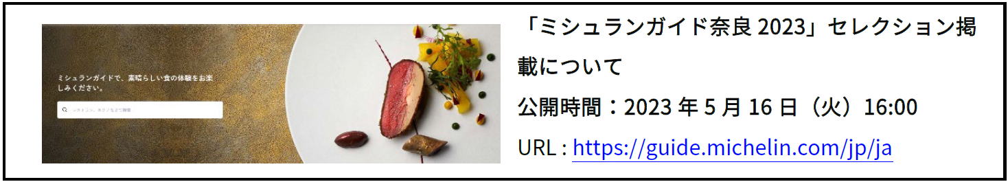 昨年5月に発表した2022年版公開後、ミシュランガイドの正社員で専任の匿名調査員は奈良県内の飲食店を再調査し、「ミシュランガイド奈良2023」として、「旅」や「食」を愛するすべての皆様におすすめの飲食店・レストランをご紹介します。