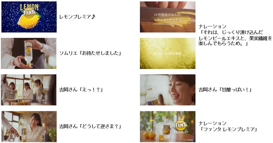 レストランで、ボトルが逆さまになった状態※で「ファンタ レモンプレミア」を提供される吉岡さん。逆さまのボトルに「えっ!?どうして逆さま?」と疑問を抱きます。逆さにすることで、じっくり漬け込んだレモンピールエキスと果実繊維が容器の中で舞い、よりおいしく「ファンタ レモンプレミア」を飲んでいただくことができます。このひと手間が加わった「ファンタ レモンプレミア」を飲んだ吉岡さんは、本格的なレモンの味わいを感じて思わず「甘酸っぱい!」と一言。こだわりの素材でレモン本来の甘味、酸味、苦みを再現した、贅沢なレモン炭酸の美味しさを吉岡さんの爽やかな笑顔とともにお伝えします。