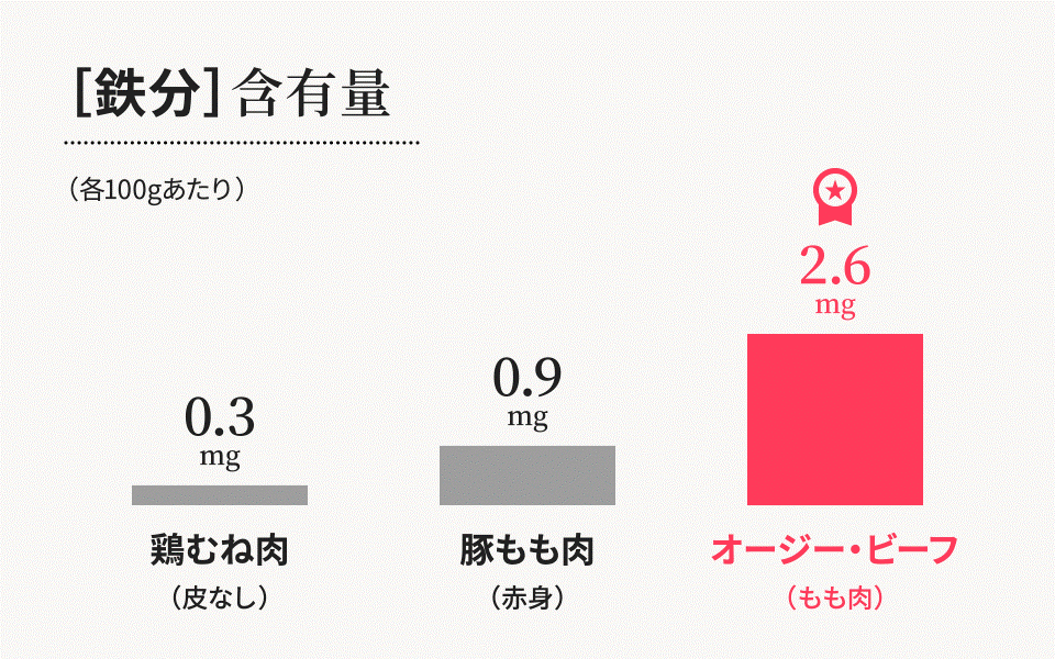 牛赤身肉のオージー・ビーフは不足しがちな“鉄”を多く含み、「疲労回復」「冷え」に効果が期待できます。また、牛赤身肉に含まれる鉄分は、野菜類の鉄分よりも吸収率が高い「ヘム鉄」で、鶏や豚、魚の数倍も豊富。しかも、たんぱく質が鉄分の吸収を高めるので、とても効率的です。