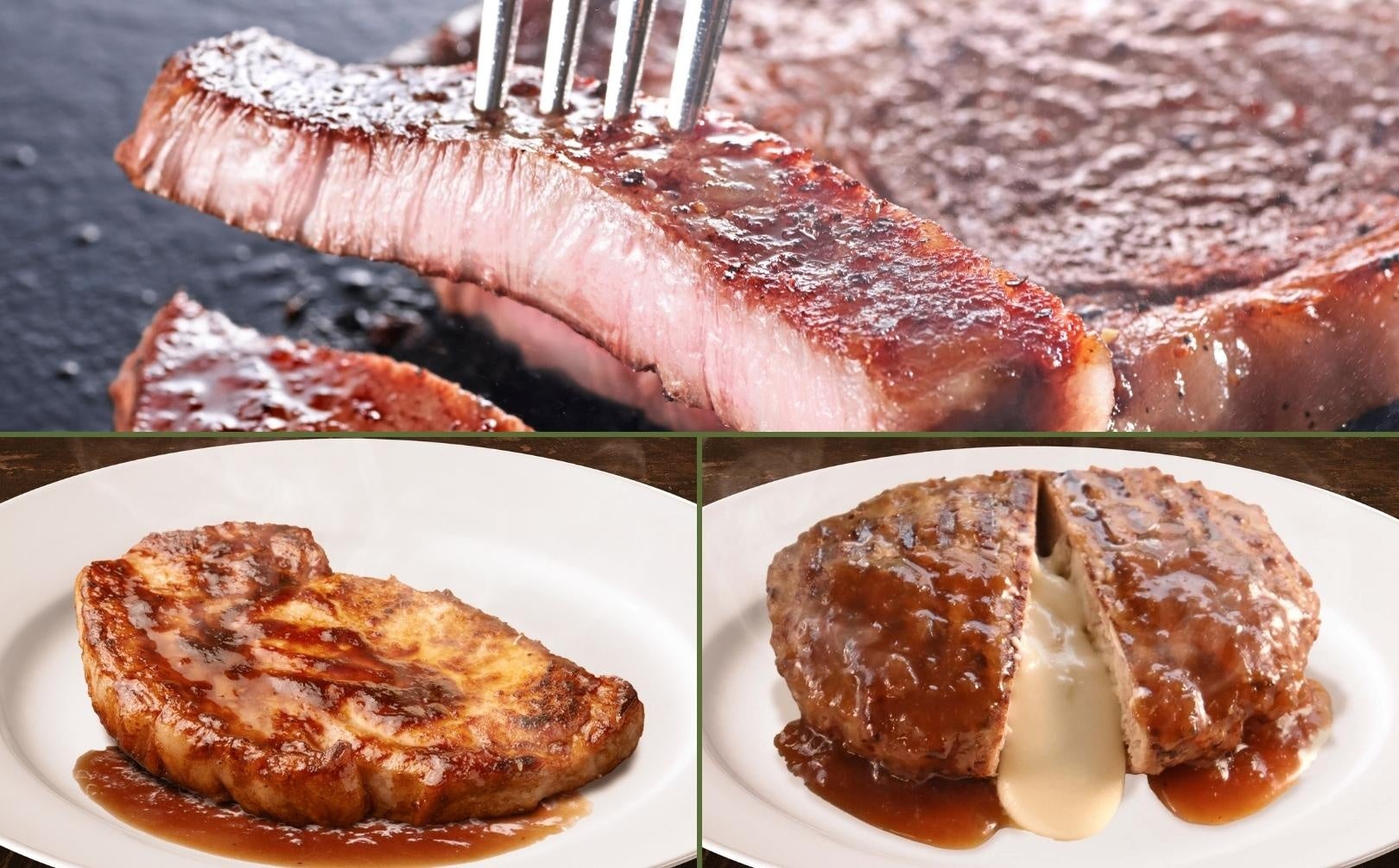 『スペシャルコース』では、濃厚なソースが絡んで食べ応え抜群の「トンテキ」と、ふっくら焼き上げたハンバーグから、肉汁と10種類のブレンドした濃厚なチーズが溢れ出す、お子様にも大好評の「チーズインハンバーグ」が仲間入り!