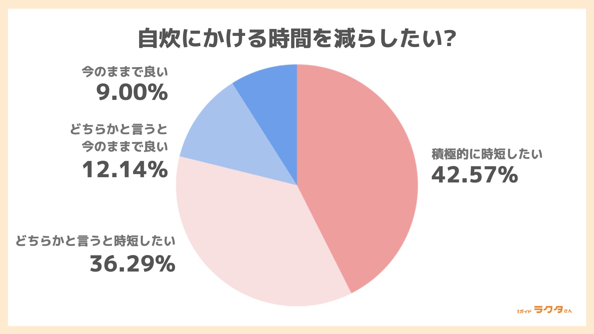 最も多かった回答は「積極的に時短したい」で、全体の42.57%。「どちらかと言えば時短したい」を選んだ人は36.29%で、合わせて約8割の人が自炊における時間短縮を望んでいることが明らかになりました。