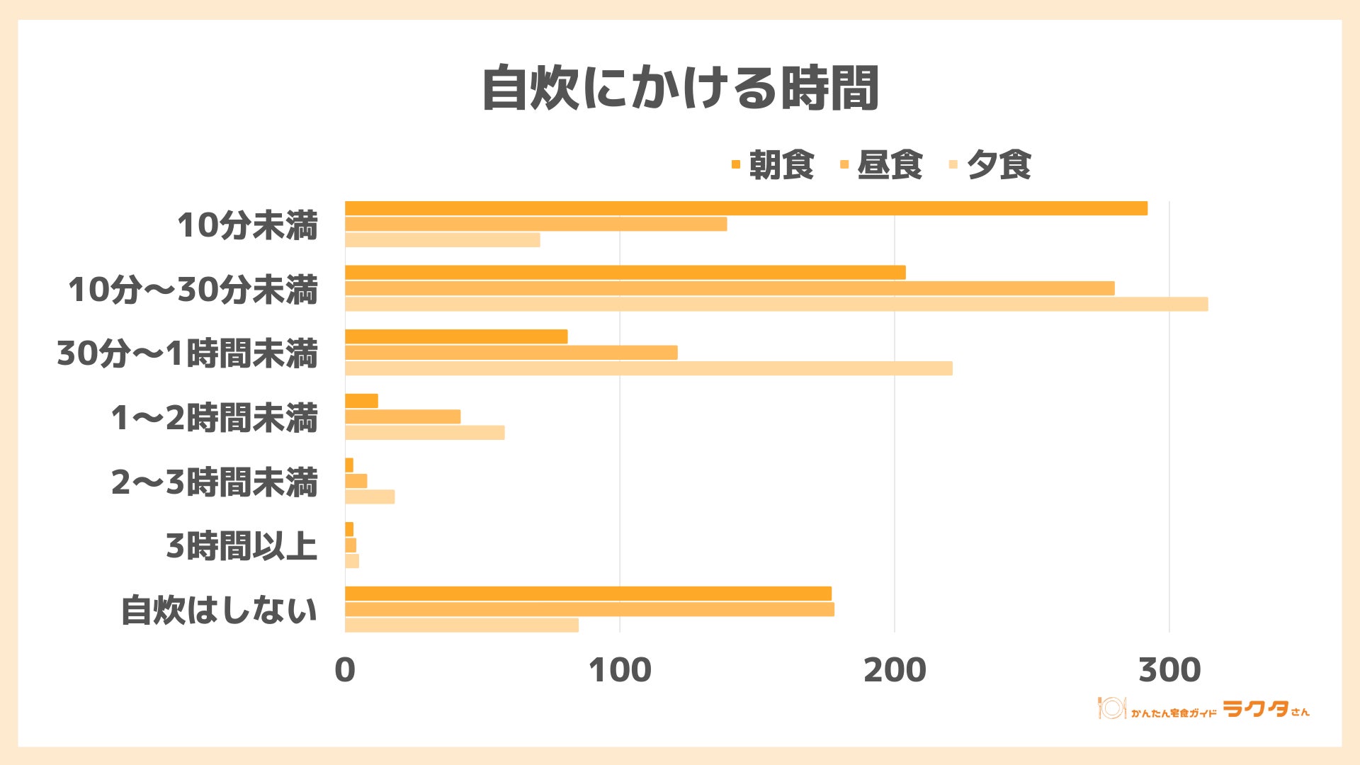 自炊にかける時間は、朝食が「10分未満」、昼食と夕食は「10分〜30分未満」が最多。