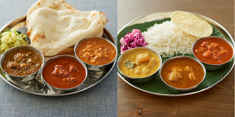 北インドのカレーセットは主食であるナンなどの小麦製品に合う濃厚な味付けのカレー、南インドのカレーセットは、主食のお米に合うスパイシーでサラッとしたカレーです。両方ともインドの定食をお手本に肉、豆、野菜のカレーにしました。1つずつ味の異なるカレーを楽しみつつ、それぞれを混ぜることで、味がマイルドになる、酸味や苦みが加わるなど味の変化も楽しむことができます。