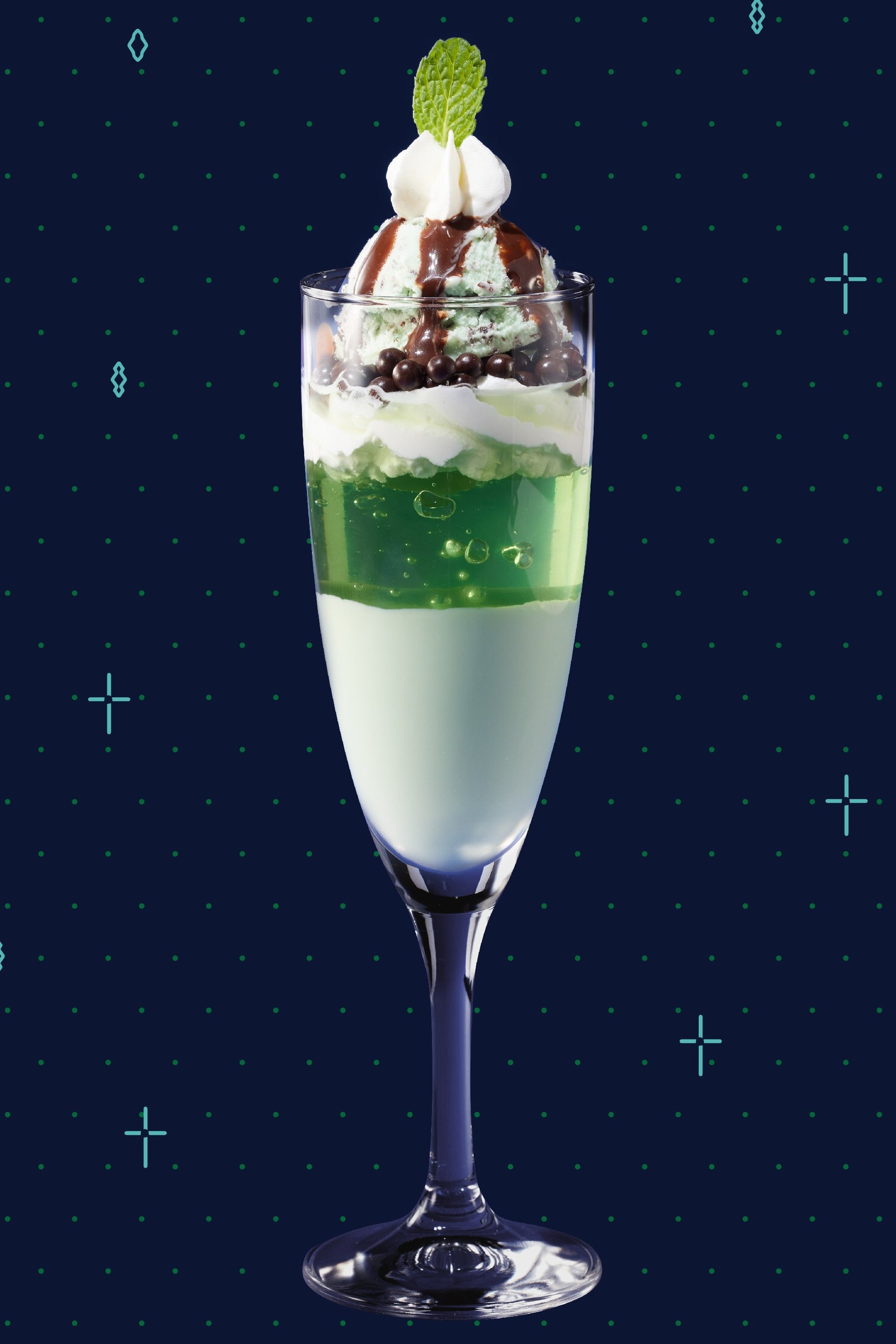 グラスの中層にあるサクサク食感のチョコクリスピーとシリアルチョコは、つるんとした舌触りのミントゼリーやミントパンナコッタに食感のアクセントを加えます。また、目を引く大きなシュガーコーンやもちもちのカラフルマシュマロは、おいしさはもちろん、お客様に見た目の楽しさを提供します。