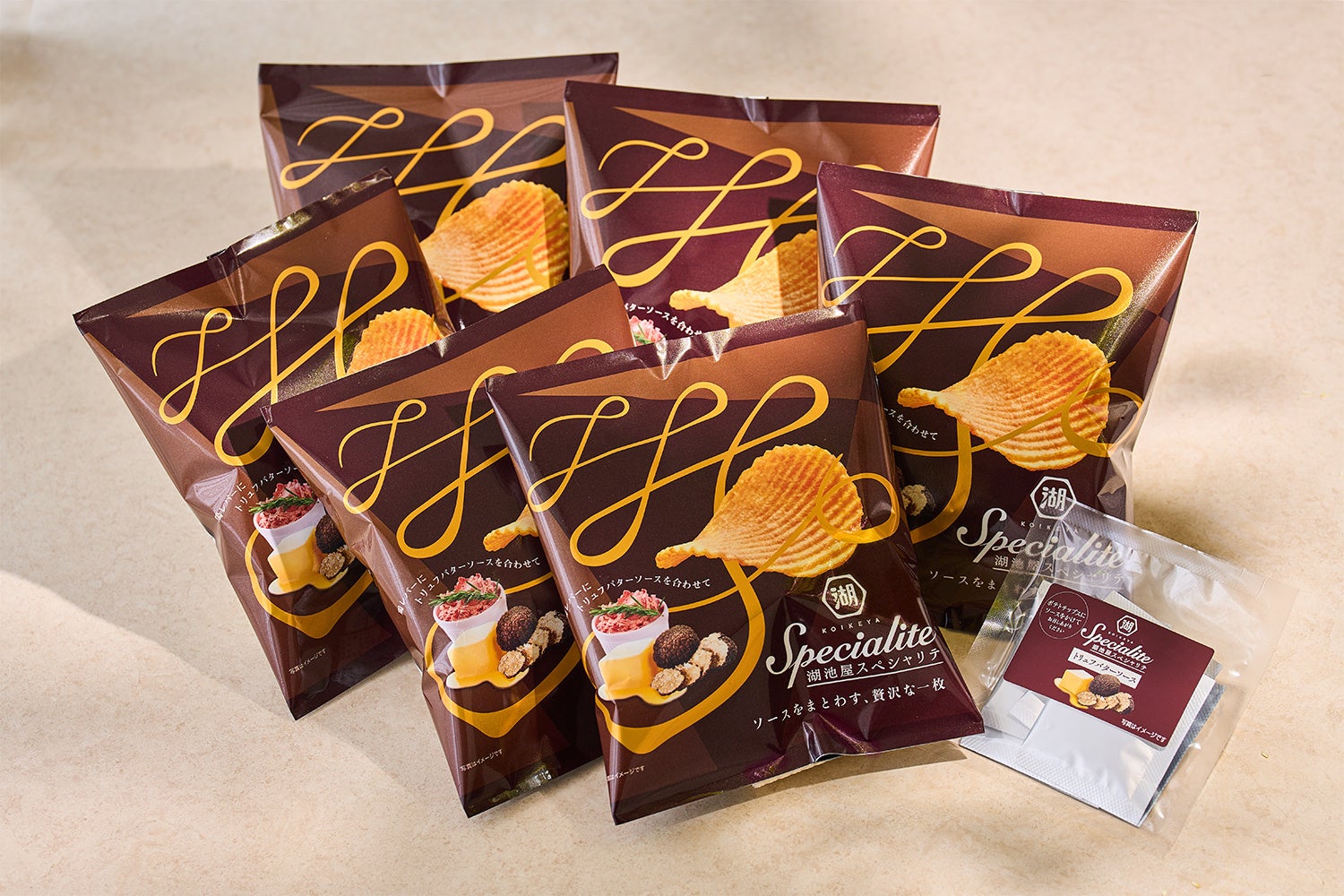 「スペシャリテ」とは、フランス料理において、その店のシェフが最も得意とする一皿のことです。日本のポテトチップスの老舗として、これまでとは違うポテトチップスの美味しい食べ方をご提案したいという想いから、「湖池屋Specialite」は誕生しました。国産じゃがいもの味わいを活かしたポテトチップスに、贅沢な味わいのソースをまとわせて食べる、まさに湖池屋の「スペシャリテ」と呼ぶに相応しい一品です。