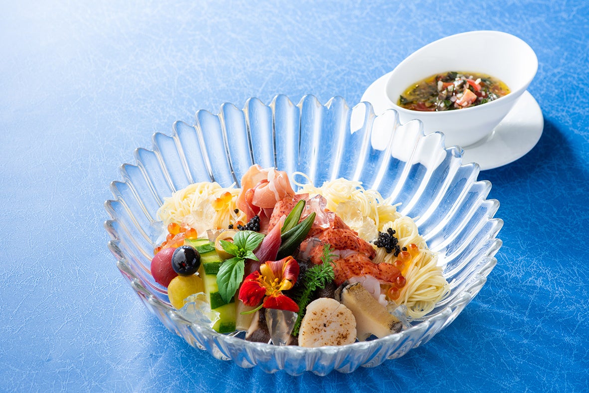 鮑・オマール海老・キャビア・いくらを使用した豪華な一皿となっております。トマト水をベースとしたオリジナルソースでお召し上がりください。