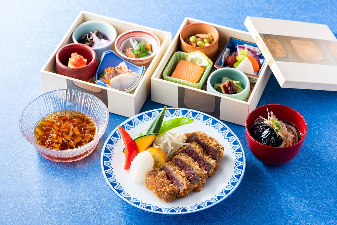 「能登牛カツのスタミナ御膳 夏彩てまり」は季節の小鉢、加賀味噌のお味噌汁がついた盛りだくさんなランチを古代箔を使用したお重でご提供いたします。能登牛のカツをメインに、柑橘が香る金沢ポン酢でさっぱりとお召し上がりください。