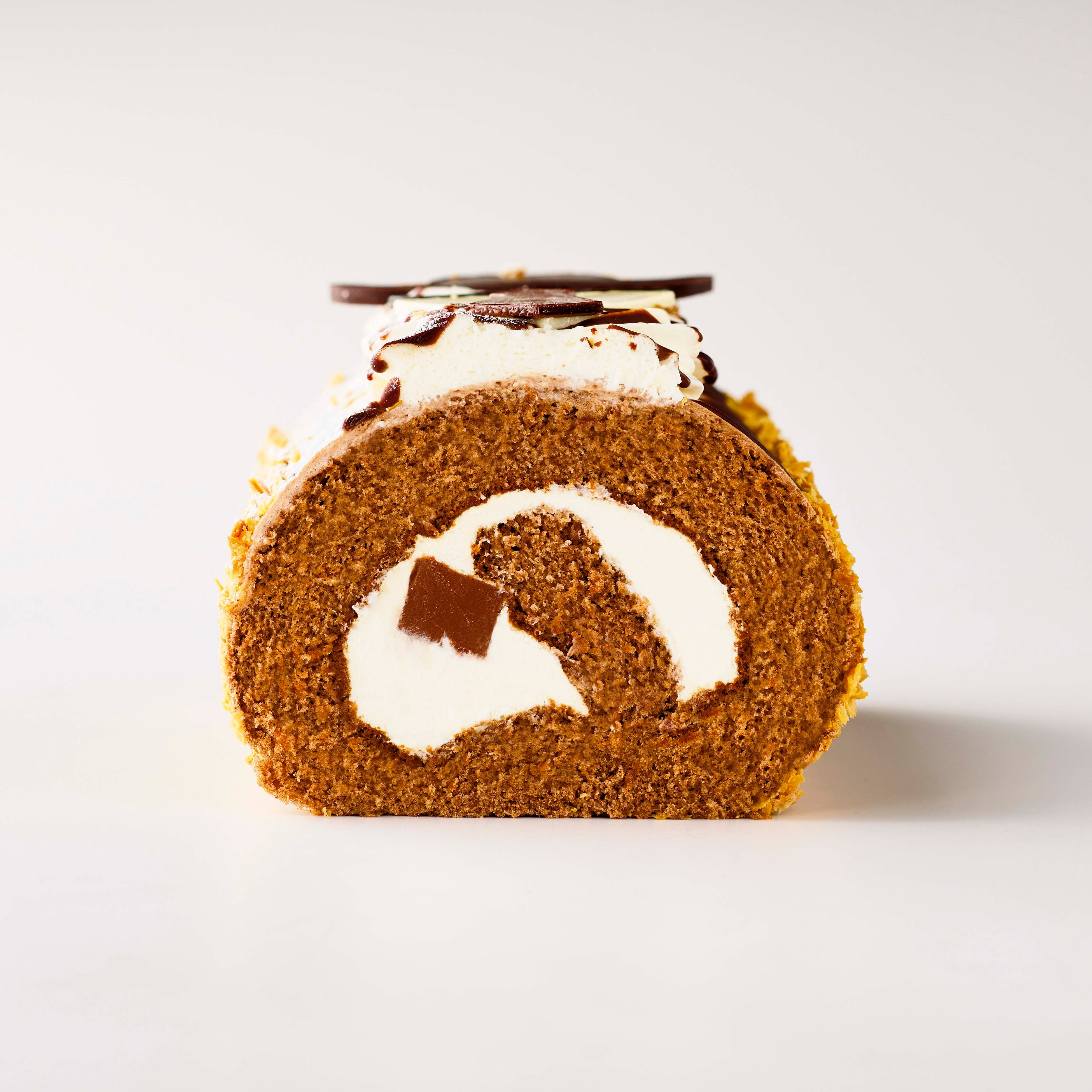しっとり焼き上げたココアたっぷりのスポンジに生クリームと生チョコレートを入れ巻き上げました。側面には食感の違いが楽しめるパフがついています。