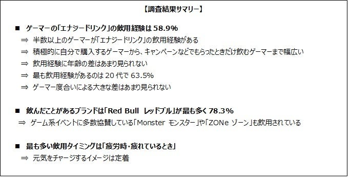 エナジードリンクの愛飲者は年齢や性別、ゲーマーの度合いに関わらず、全体的に分散していることがわかりました。このことからも改めてエナジードリンクが国民的なドリンクとして浸透していることがわかります。