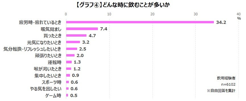 次に、どんな時に飲用しているのかを調査しました。最も多かったのは「疲労時・疲れているとき」で、全体の34.2%と突出しています。続いて「眠気覚まし」が7.4%、「貰ったとき」が4.7%と続きますが、全体の約1/3が疲労時の対策としてエナジードリンクを飲用していることがわかります。